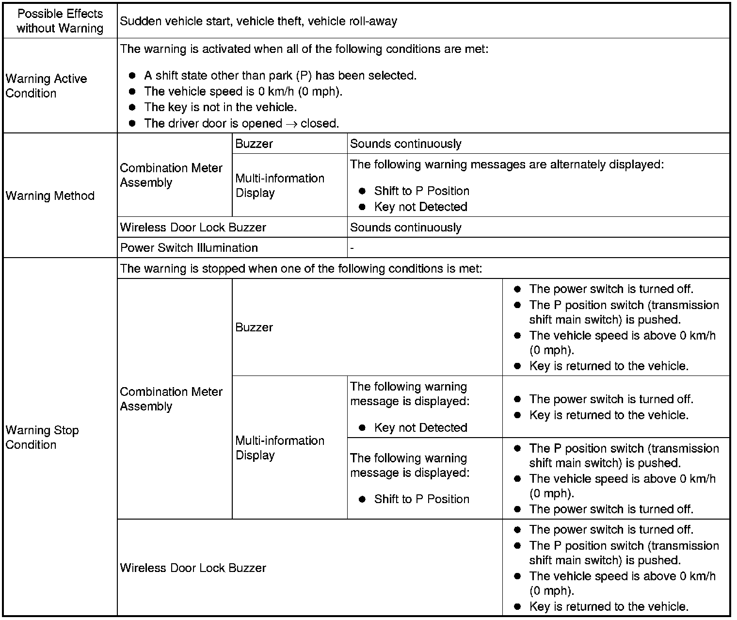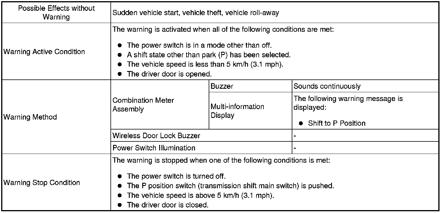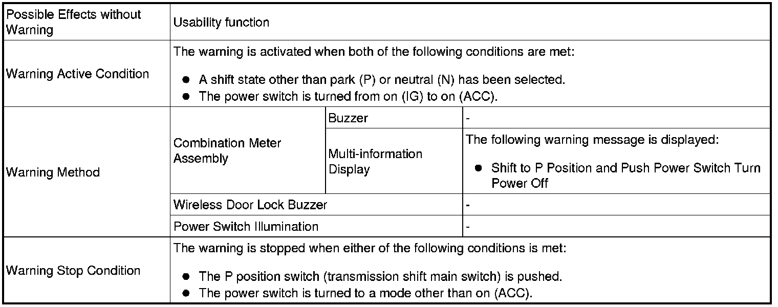 * A warning message appears on the multi-information display when the driver attempts to turn the power switch off with a shift state other than park (P) or neutral (N) has been selected.