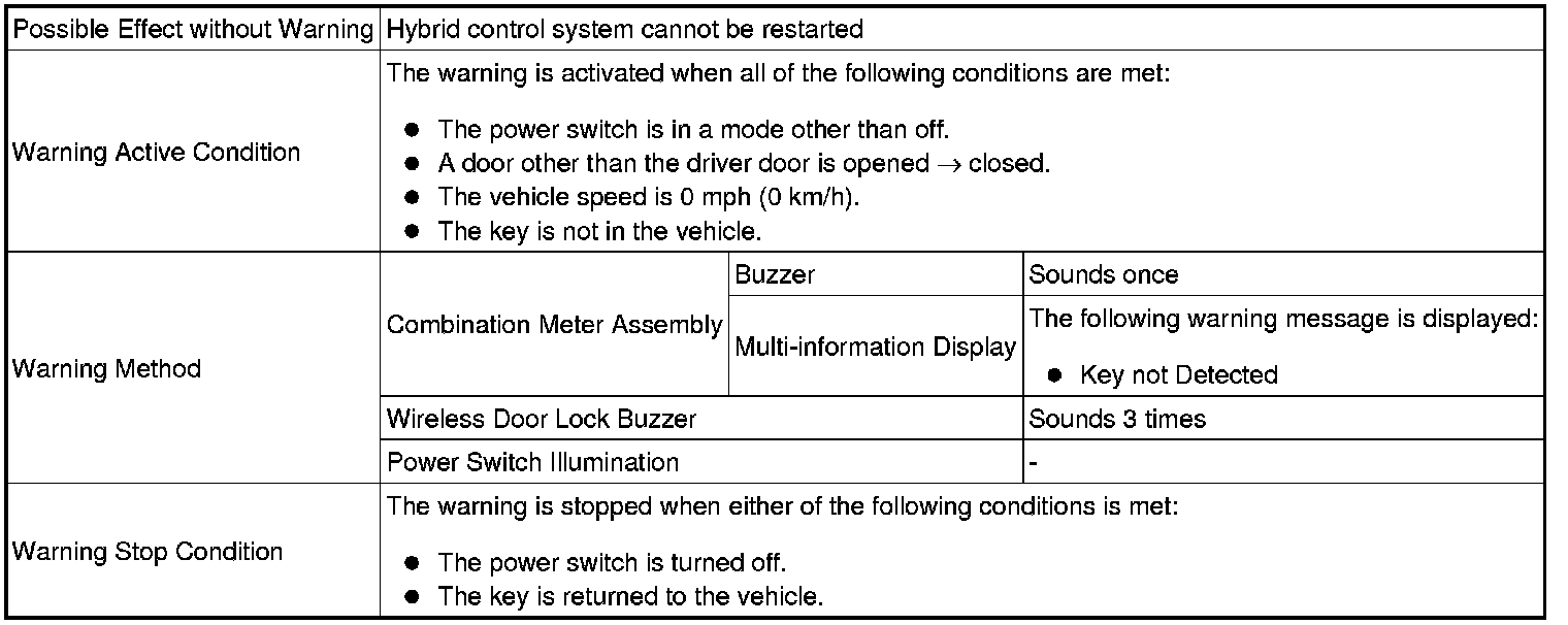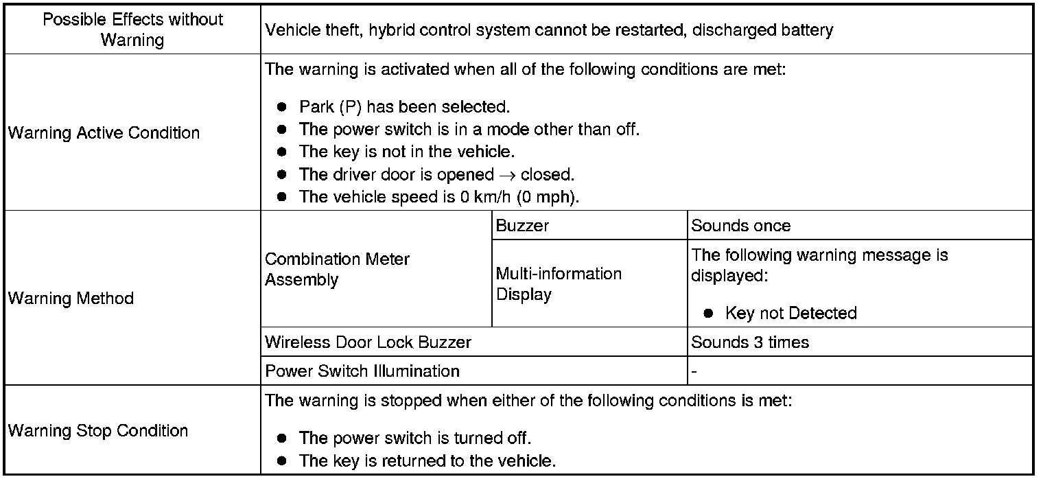 When the hybrid control system is left running and park (P) has been selected, the driver closes the driver door and attempts to leave the vehicle while holding the key.