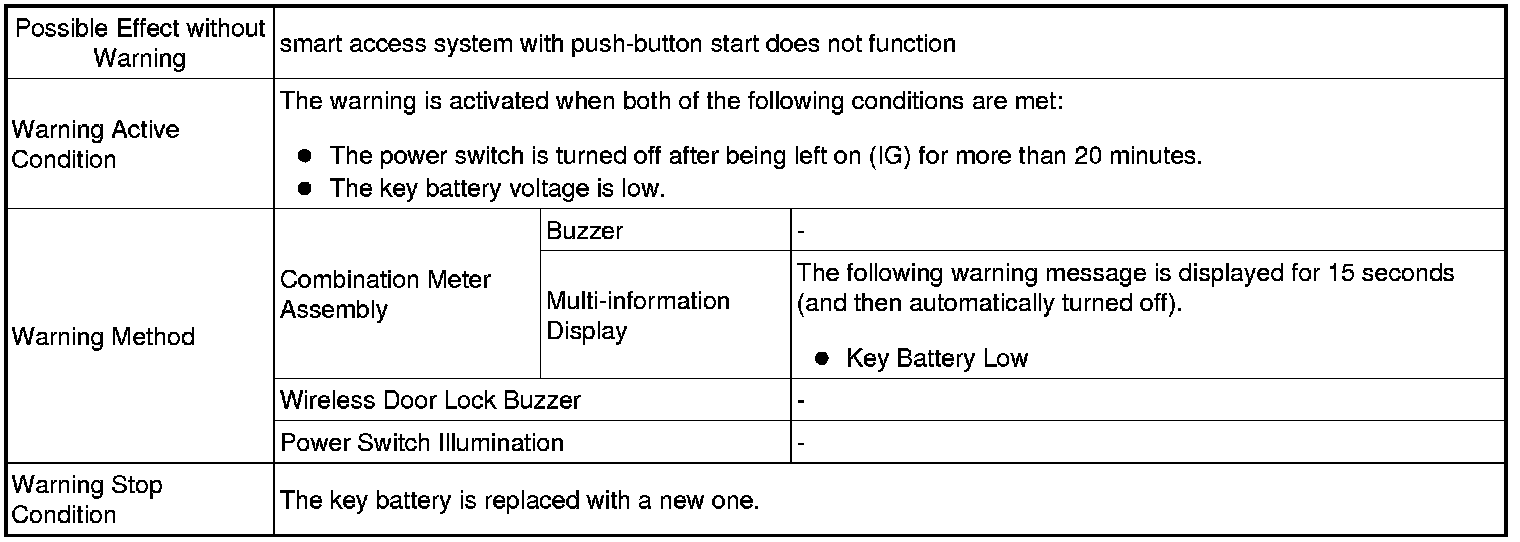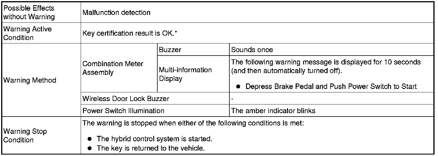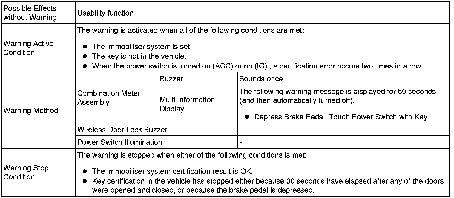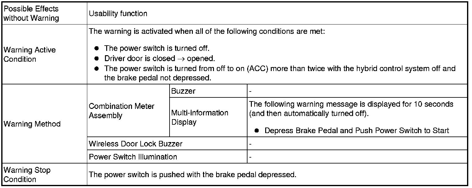 (1) When any of the situations below occur, the smart access system with push-button start causes the certification ECU (smart key ECU assembly) to sound a buzzer in the combination meter assembly and the wireless door lock buzzer, a message to appear on the multi-information display, and the power switch illumination to operate in order to alert the driver.