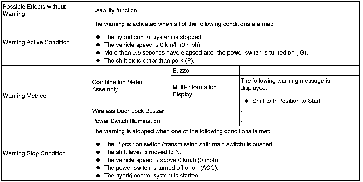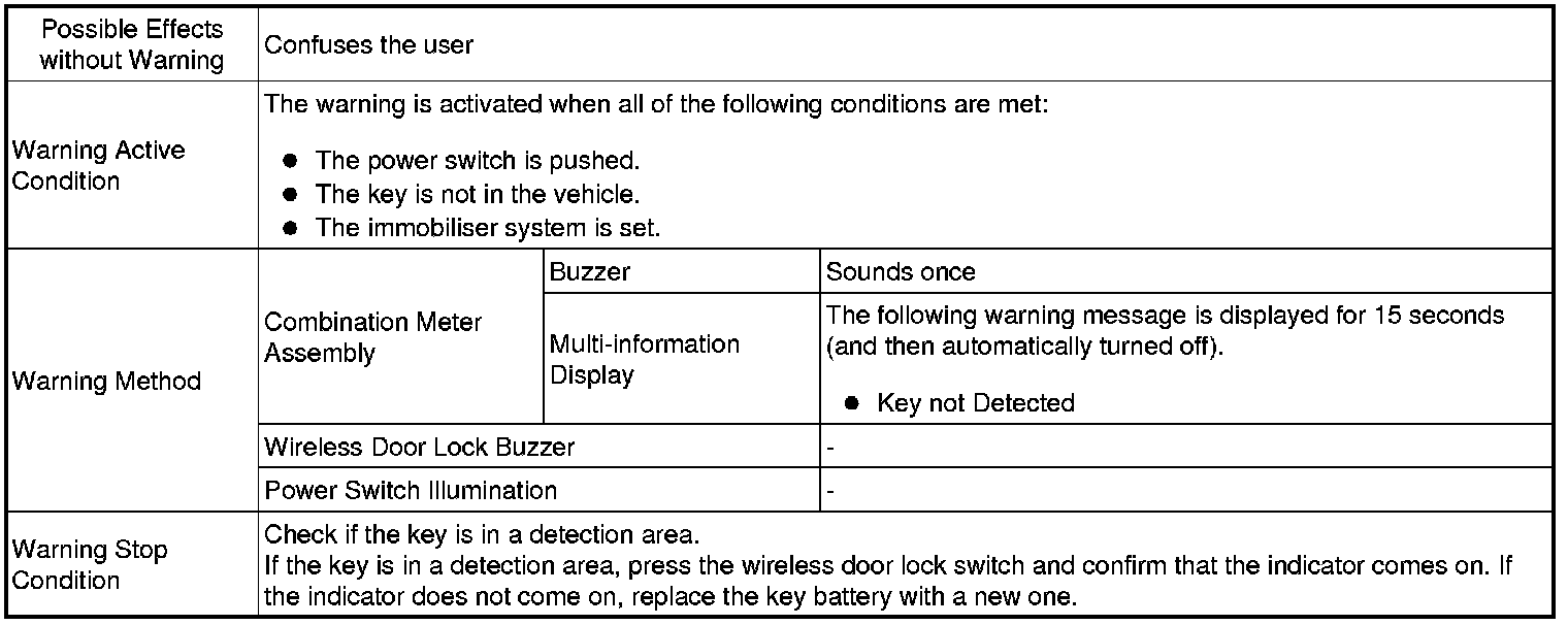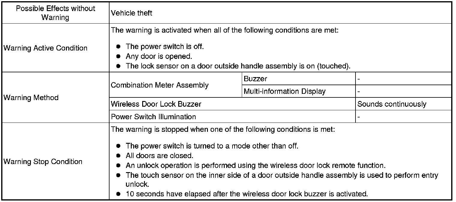 (1) When any of the situations below occur, the smart access system with push-button start causes the certification ECU (smart key ECU assembly) to sound a buzzer in the combination meter assembly and the wireless door lock buzzer, a message to appear on the multi-information display, and the power switch illumination to operate in order to alert the driver.