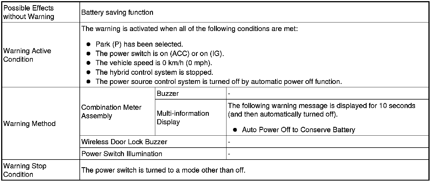 * A warning message appears on the multi-information display when automatic power off operation occurs.