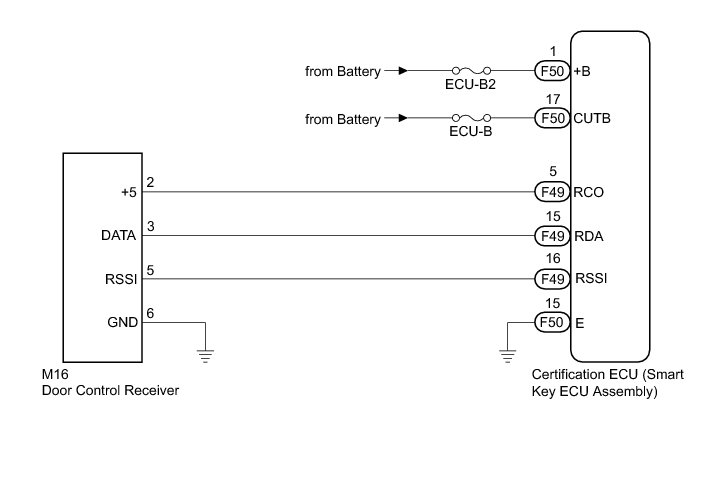 When the entry door lock and unlock functions and wireless door lock and unlock functions do not operate, radio wave interference, or a malfunction in the key or signal circuit between the door control receiver and certification ECU (smart key ECU assembly) is suspected. The signal circuit is shared by the entry function and wireless door lock function.