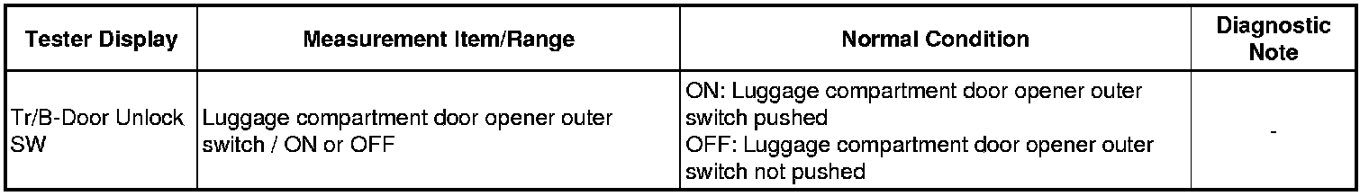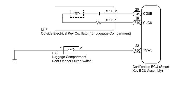 When the luggage compartment door entry unlock function does not operate, one of the following may be the cause: 1) luggage compartment door opener outer switch malfunction; 2) communication malfunction between the outside electrical key oscillator (for luggage compartment) and certification ECU (smart key ECU assembly); 3) the main body ECU (multiplex network body ECU) receives the luggage compartment door opener outer switch ON signal, but is unable to send the signal to the certification ECU (smart key ECU assembly) through CAN communication; or 4) certification ECU (smart key ECU assembly) malfunction.
