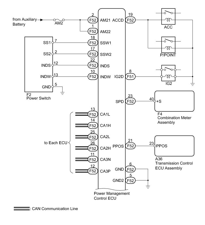 * When the power management control ECU is replaced with a new one and the cable from the negative (-) auxiliary battery terminal is connected, the power source mode becomes on (IG) mode. When the auxiliary battery is removed and reinstalled, power source mode that was selected when the auxiliary battery was removed is restored.