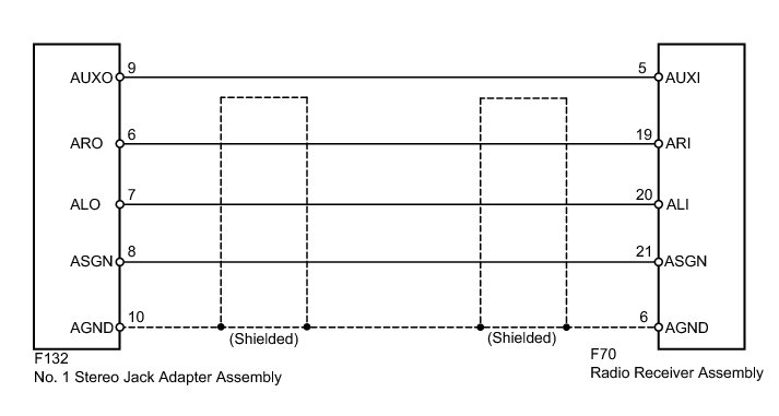 The No. 1 stereo jack adapter assembly sends an external device sound signal to the radio receiver assembly through this circuit.