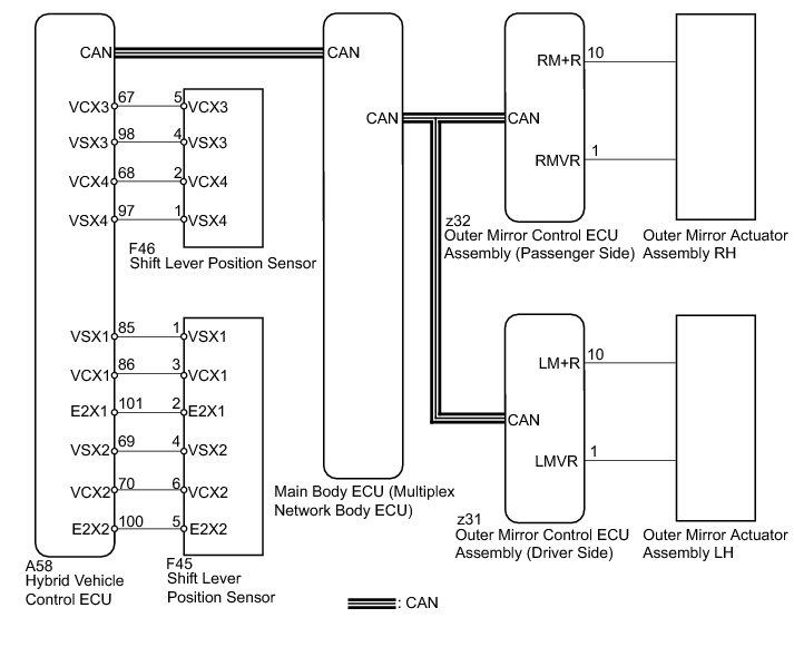 On receiving a reverse signal from the shift lever position sensor, the hybrid vehicle control ECU sends the reverse signal to the main body ECU (multiplex network body ECU) via CAN communication. When receiving the reverse signal, the main body ECU (multiplex network body ECU) sends the reverse request signal to each outer mirror control ECU assembly. Each outer mirror control ECU assembly then performs control in response to the reverse signal.