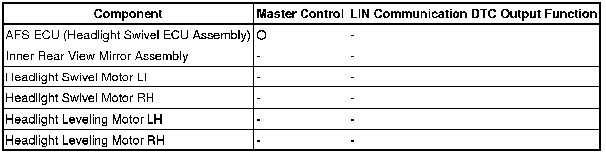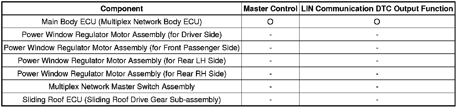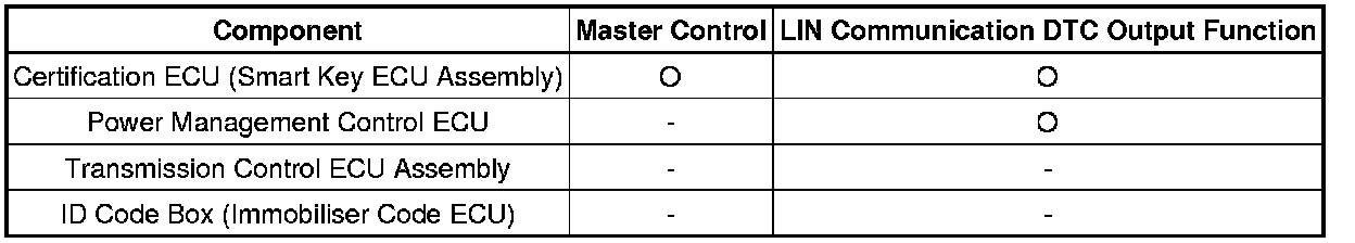 The LIN communication system is used for communication between the components in the tables below. If communication cannot be performed through LIN communication because of an open in the communication lines or other reason, the master control ECU of the relevant system will output a DTC. Refer to the table below about the communication bus lines and connected components.
