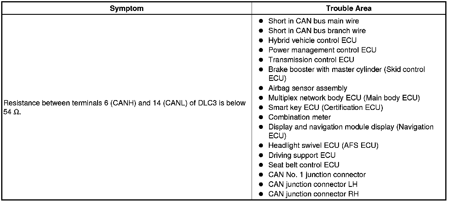 There may be a short circuit in the CAN No. 1 bus main wire and/or CAN branch wire when the resistance between terminals 6 (CANH) and 14 (CANL) of the DLC3 is below 54 Ohms.