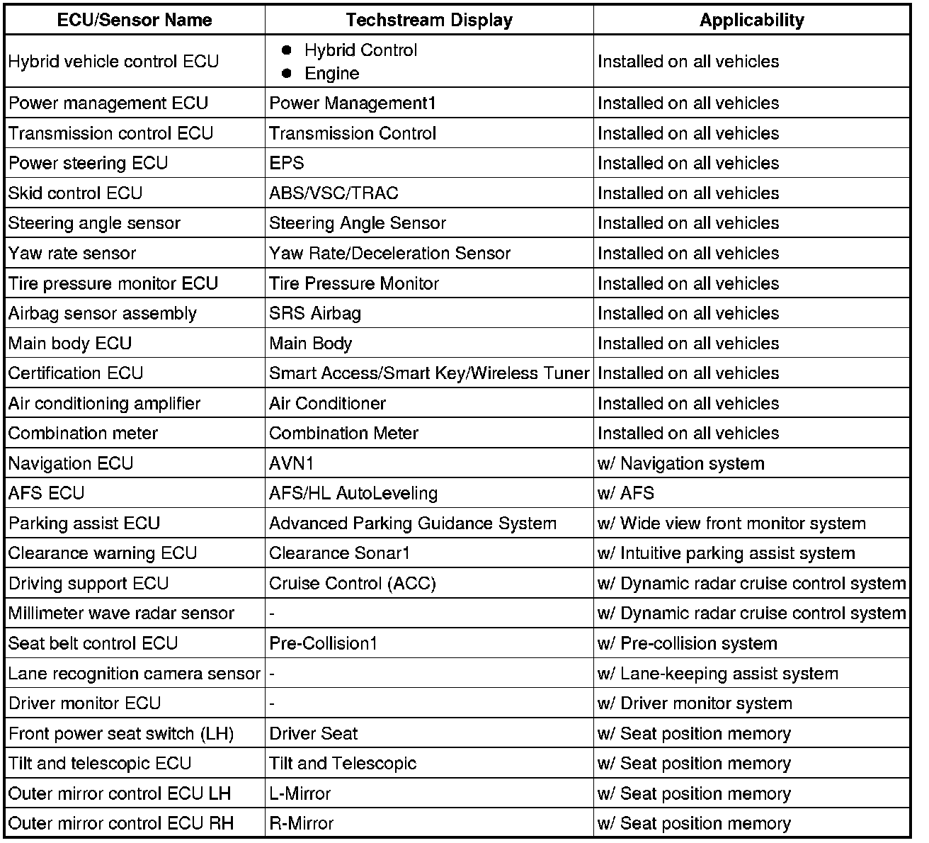 The ECUs and sensors that are properly connected to the CAN communication system can be displayed using the Techstream.