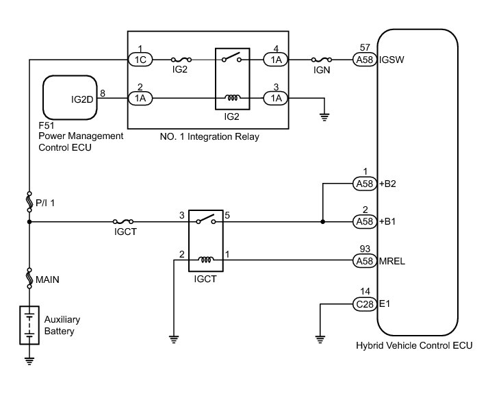 When the power switch is turned on (IG), battery voltage is applied to IGSW of the hybrid vehicle control ECU. The output signal from the MREL terminal of the hybrid vehicle control ECU causes a current to flow to the coil, closing the contacts of the IGCT relay and supplying power to either terminal +B1 and +B2 of the hybrid vehicle control ECU.