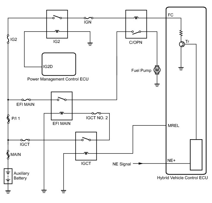 When the NE signal is input to the hybrid vehicle control ECU, Tr is turned on, current flows to the coil of the C/OPN relay, the relay switches on, power is supplied to the fuel pump and the fuel pump operates.