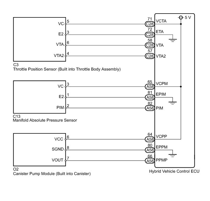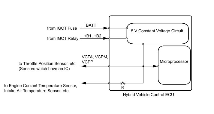 The hybrid vehicle control ECU constantly uses 5 V from the auxiliary battery voltages supplied to the +B (BATT) terminal to operate the microprocessor. The hybrid vehicle control ECU also provides this power to the sensors through the VC output circuit.