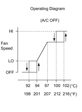 * The coolant temperature at which the fans start operating is approximately 94°C (201°F).