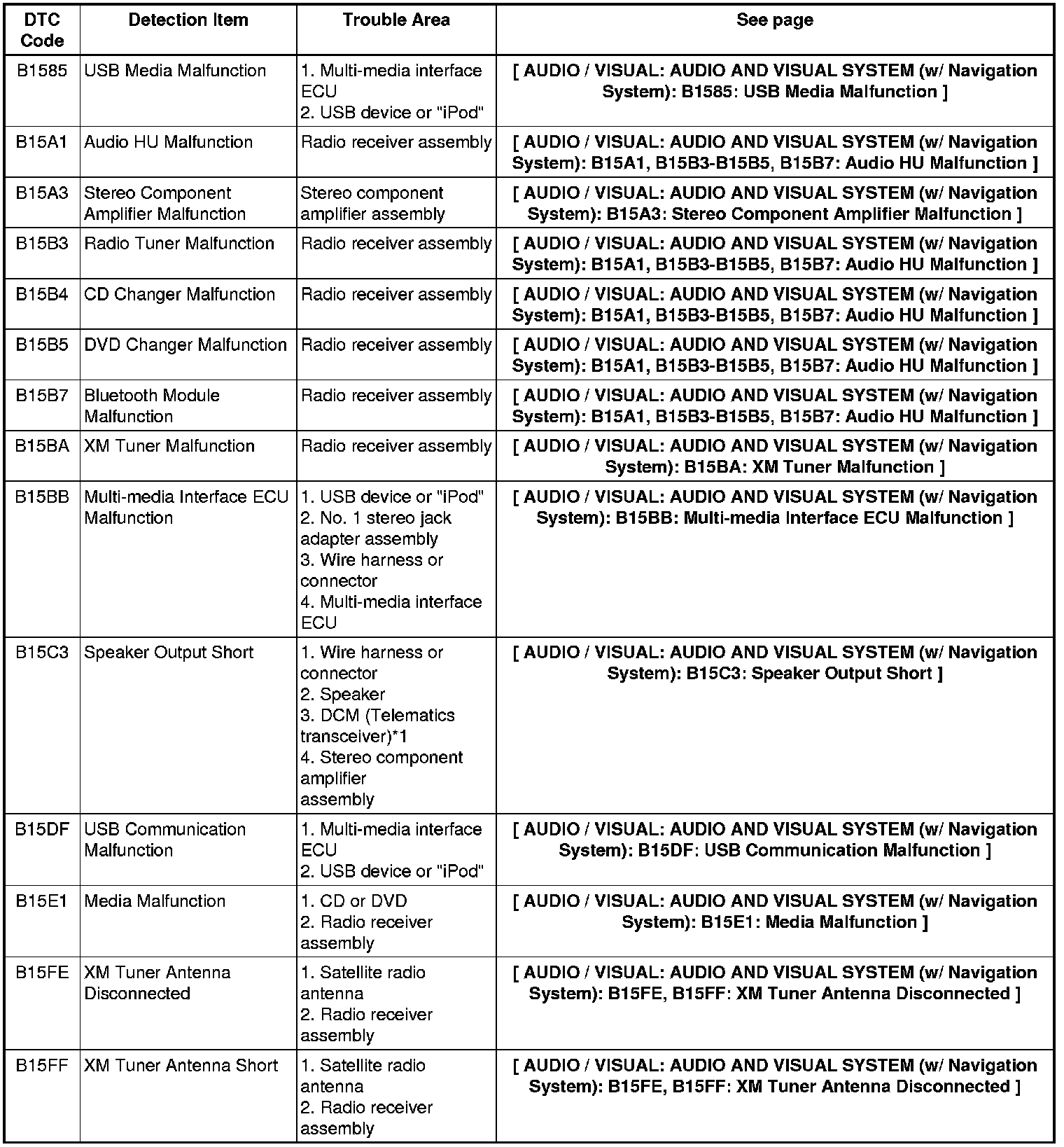 AUDIO / VISUAL: AUDIO AND VISUAL SYSTEM (w/ Navigation System): DIAGNOSTIC TROUBLE CODE CHART