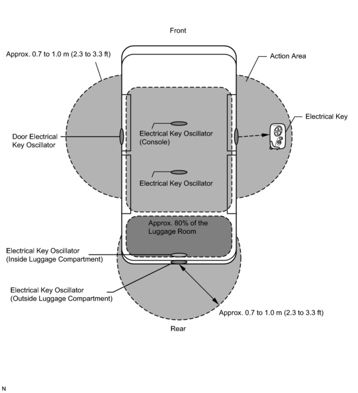 Each oscillator transmits the request signal received from the certification ECU, and forms an electrical key detection area to detect the presence of an electrical key. The detection area formed by each door oscillator and luggage compartment outer oscillator is approximately 0.7 to 1.0 m (2.3 to 3.3 ft.) from the outside handle of each door or the center of the rear bumper.