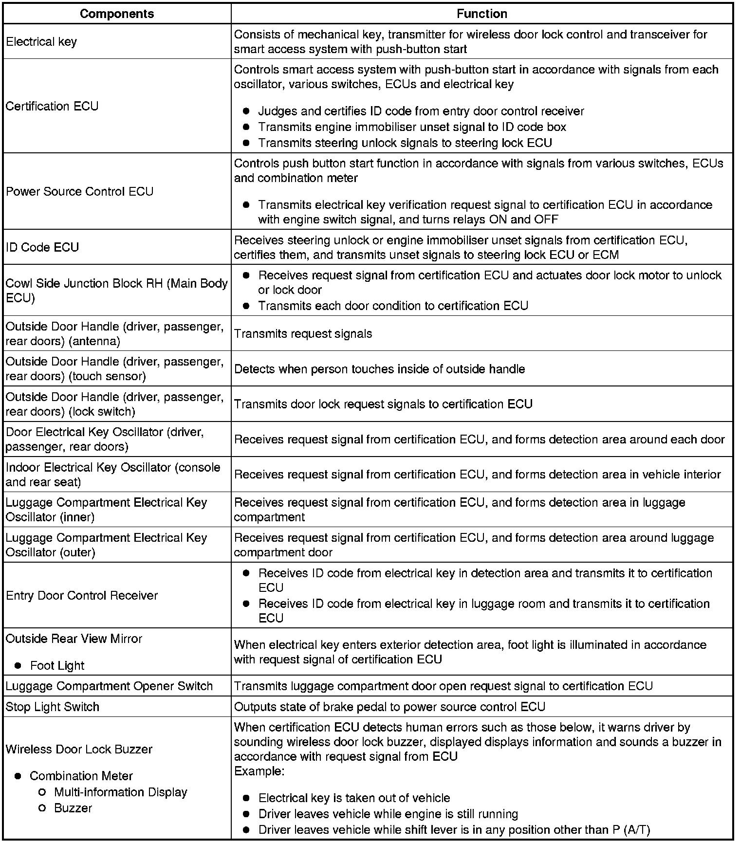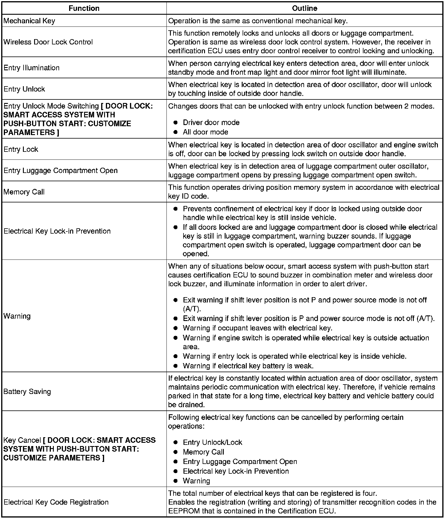 (a) In addition to conventional mechanical key and wireless door lock control functions, the smart access system with push-button start enables door locking/unlocking, steering lock releasing, engine starting and luggage compartment door opening without operating the electrical key. The only requirement is that the electrical key is in the user's possession.