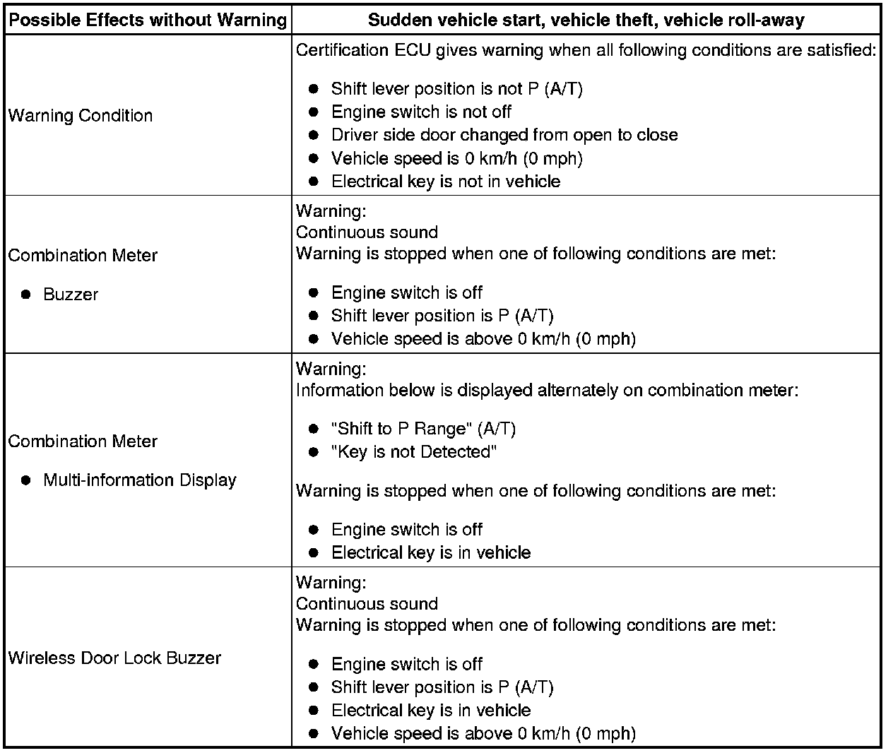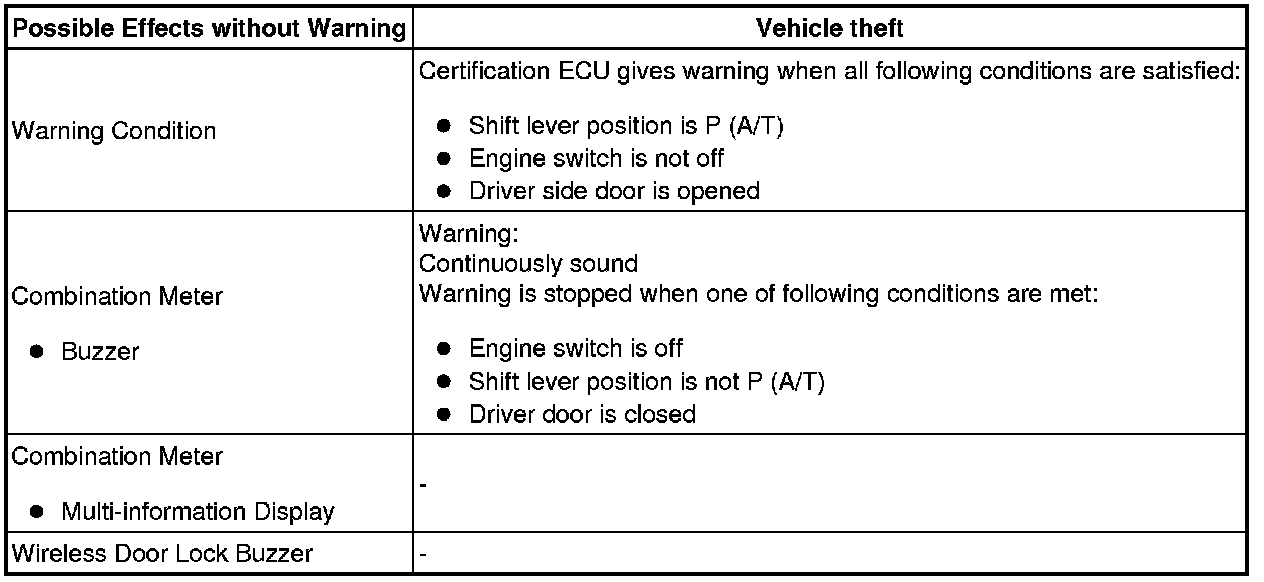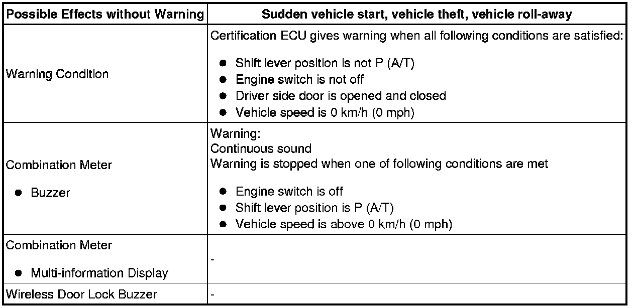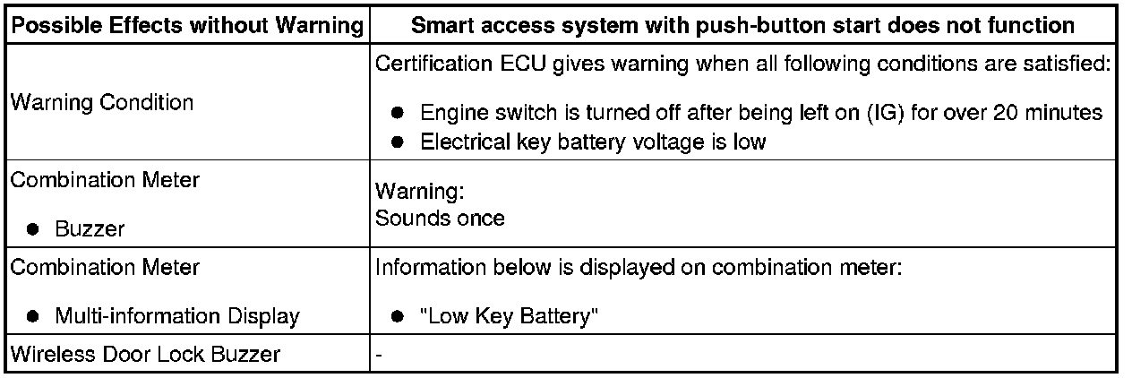 When any of the situations below occur, the smart access system with push-button start causes the certification ECU to sound the buzzer in the combination meter and the wireless door lock buzzer, and illuminate the combination meter's multi-information display in order to alert the driver.