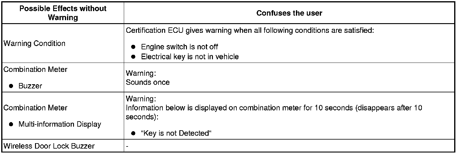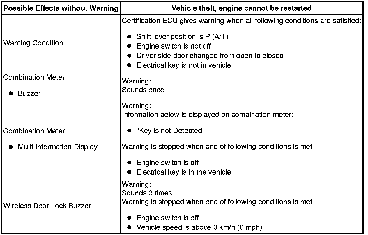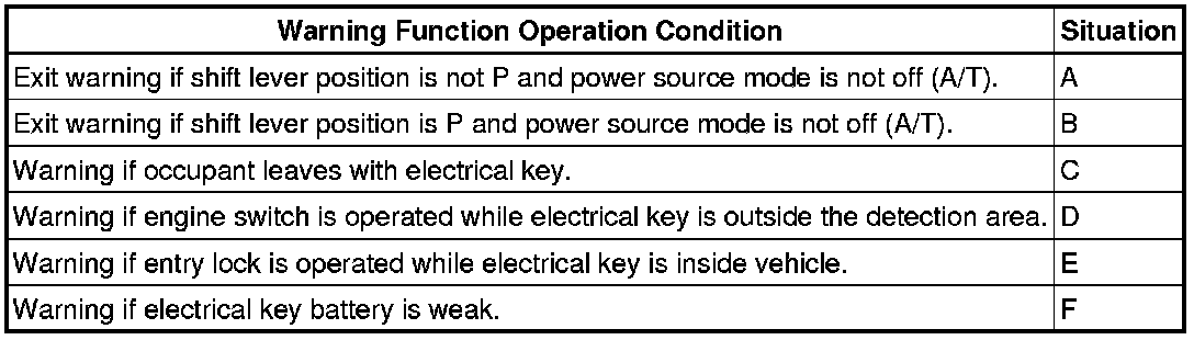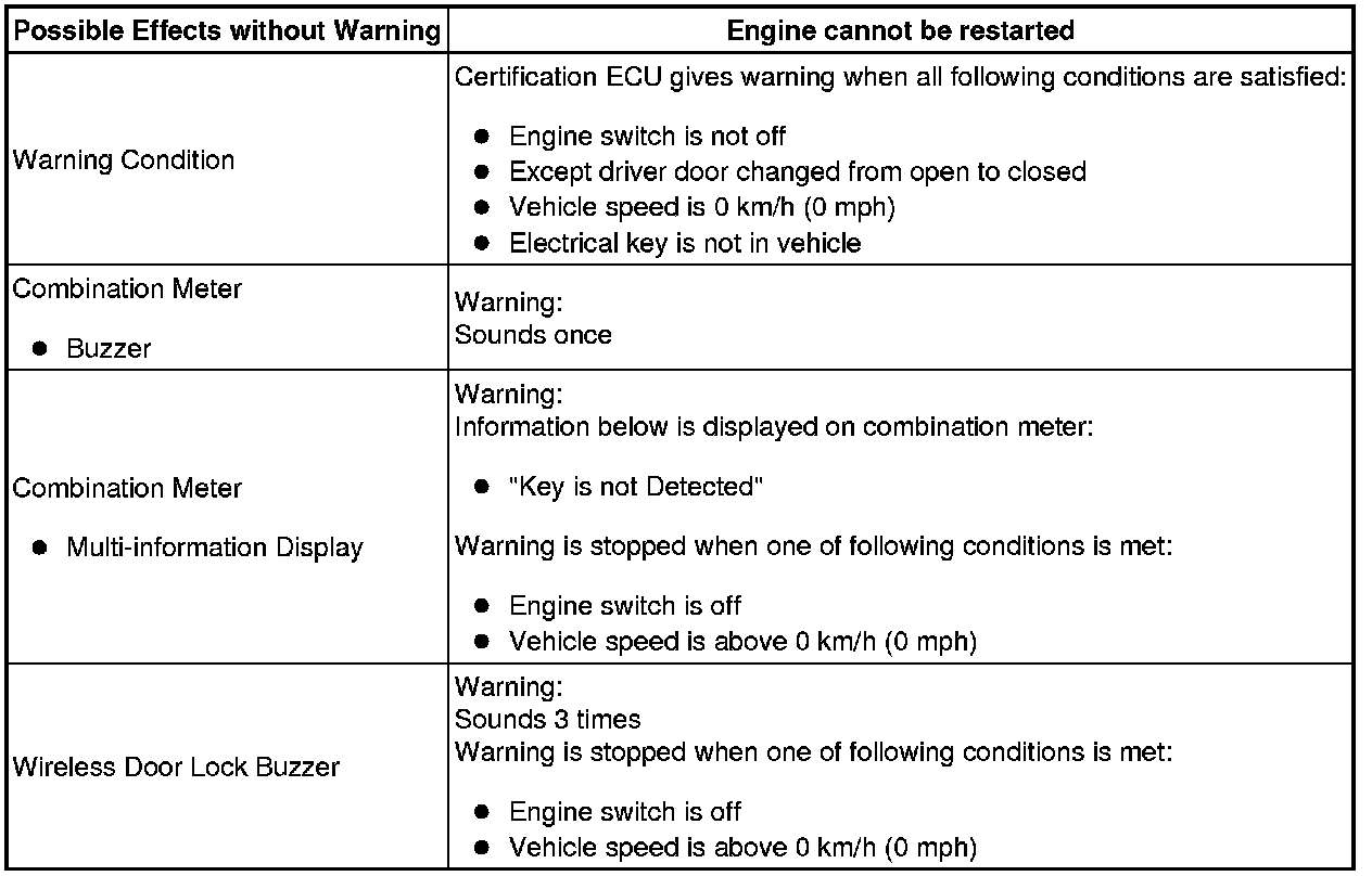 When any of the situations below occur, the smart access system with push-button start causes the certification ECU to sound the buzzer in the combination meter and the wireless door lock buzzer, and illuminate the combination meter's multi-information display in order to alert the driver.