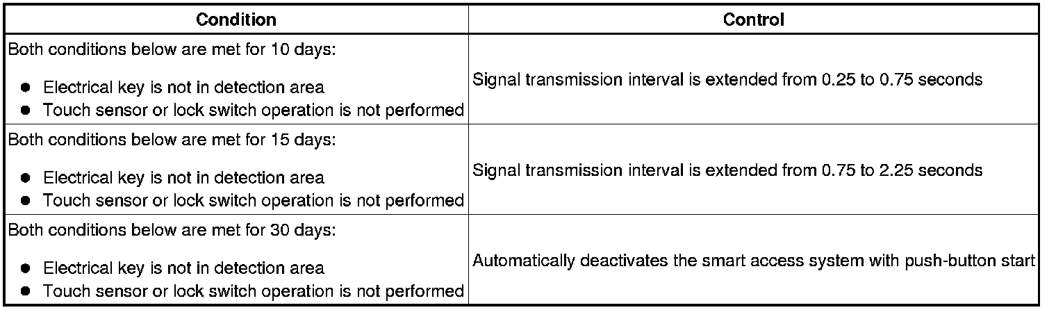 In the smart access system with push-button start, signals are emitted outside of the vehicle at a prescribed interval (0.25 seconds) when the doors are locked. Therefore, the vehicle battery could be drained if the vehicle remains parked for a long time. For this reason, the controls listed below are affected: