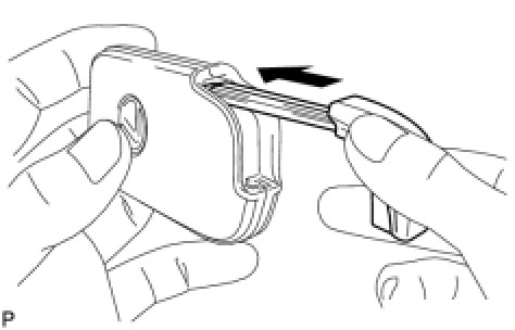 (a) Push in and install the transmitter battery (lithium battery) while being careful of the following: 1) the orientation of the battery positive (+) and negative (-) terminals; and 2) being sure to insert the battery between the 2 terminals and deep into the card, in the direction shown by the arrow in the illustration.