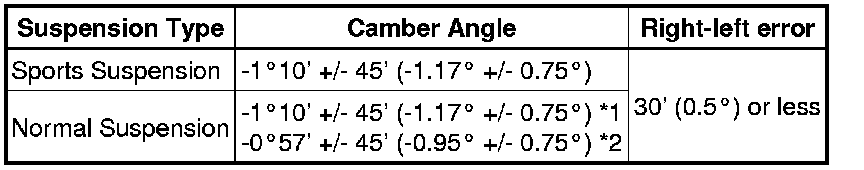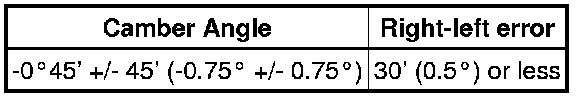 If the measured value is not within the specified range, inspect the suspension parts for damage and wear. Replace parts as necessary because camber cannot be properly adjusted with any damaged or worn parts.