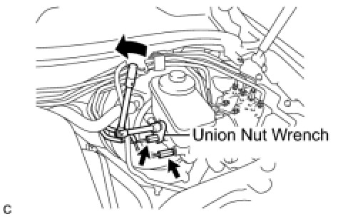 (a) Using a union nut wrench (10 mm), disconnect the 2 brake lines from the master cylinder.