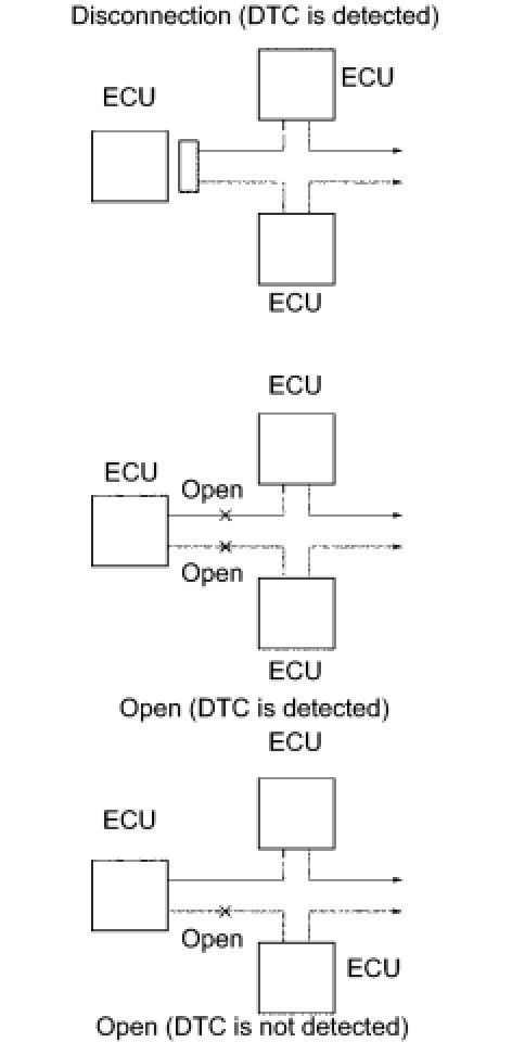 (3) If DTC of ECU communication stop is output, connectors may be disconnected, or communication buses may be open at 2 points. It will not become abnormal with only 1 communication bus open.