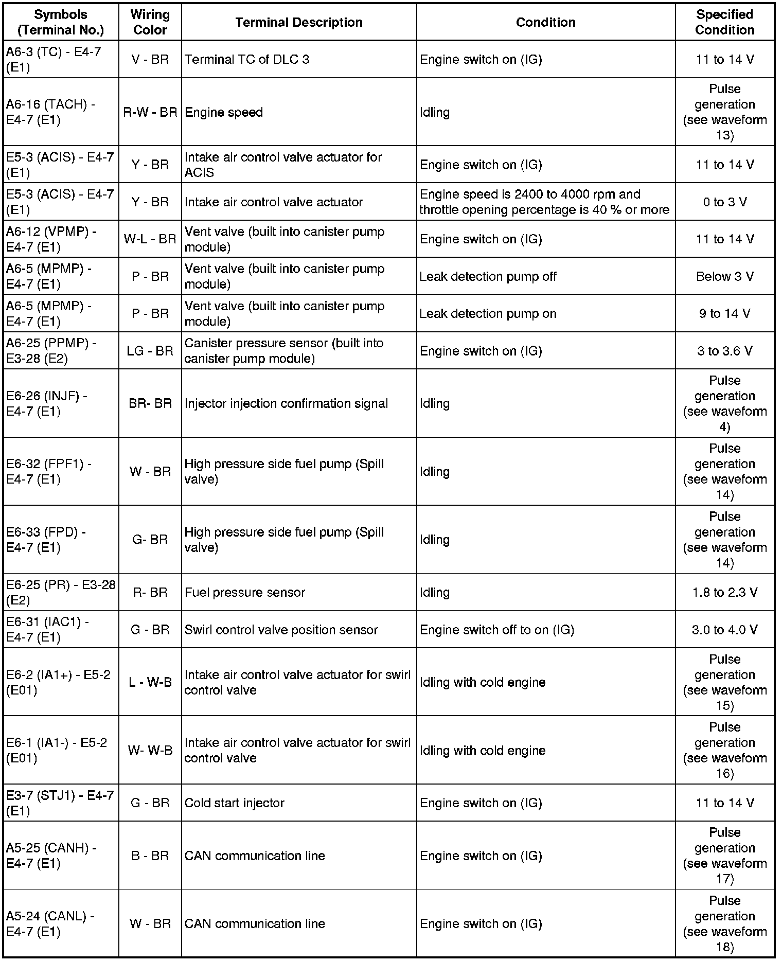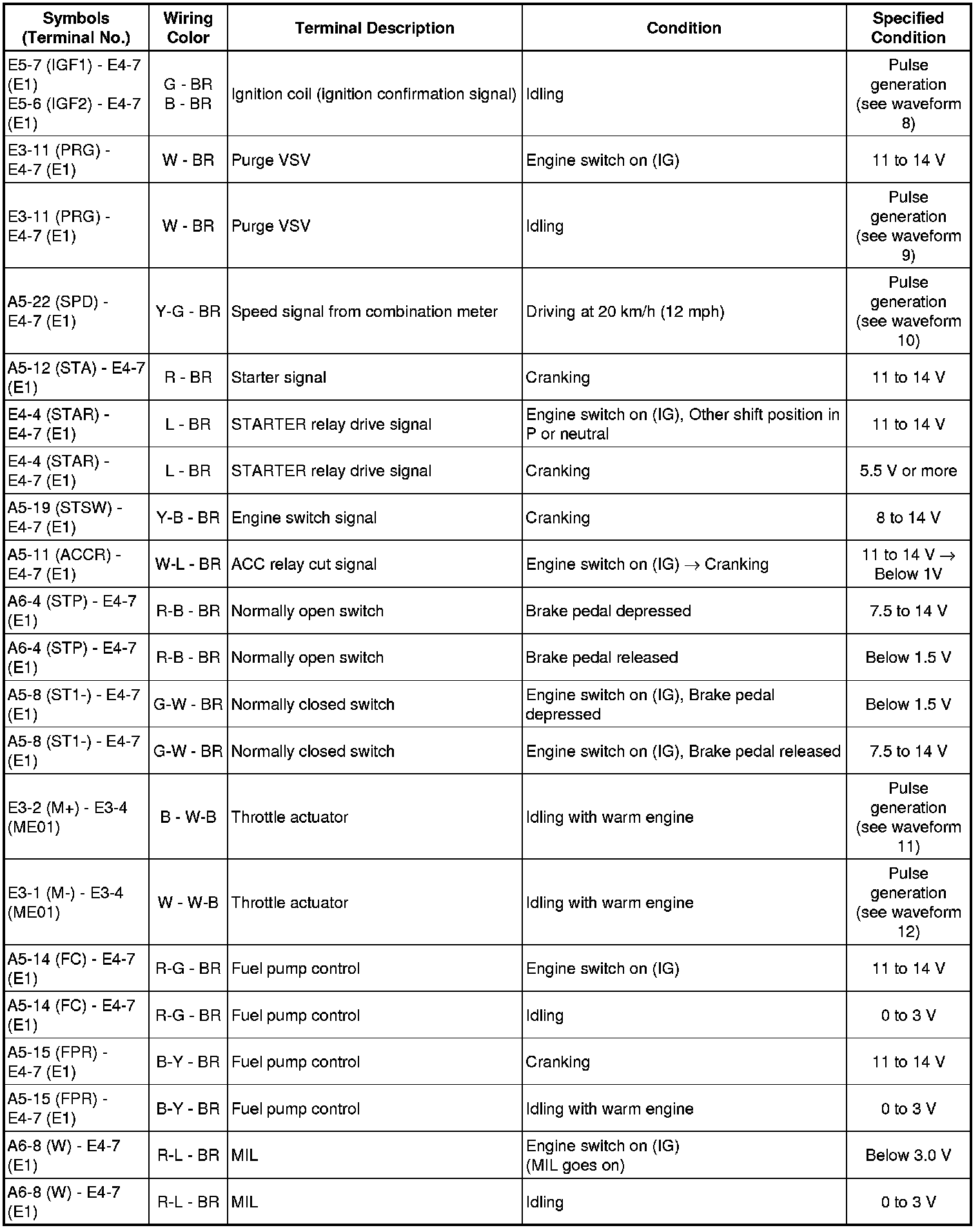 The standard normal voltage between each pair of the ECM terminals is shown in the table below. The appropriate conditions for checking each pair of the terminals are also indicated. The result of checks should be compared with the standard normal voltage for that pair of terminals, displayed in the Specified Condition column. The illustration above can be used as a reference to identify the ECM terminal locations.