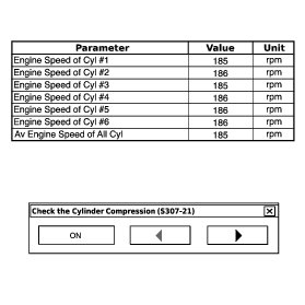 In this Active Test, the fuel and ignition of all cylinders is cut. The engine must then be cranked for approximately 10 seconds. At this time, the speed of each cylinder is measured. If the speed of one cylinder is more than the other cylinders, it can be determined that the compression pressure of that cylinder is lower than the other cylinders.
