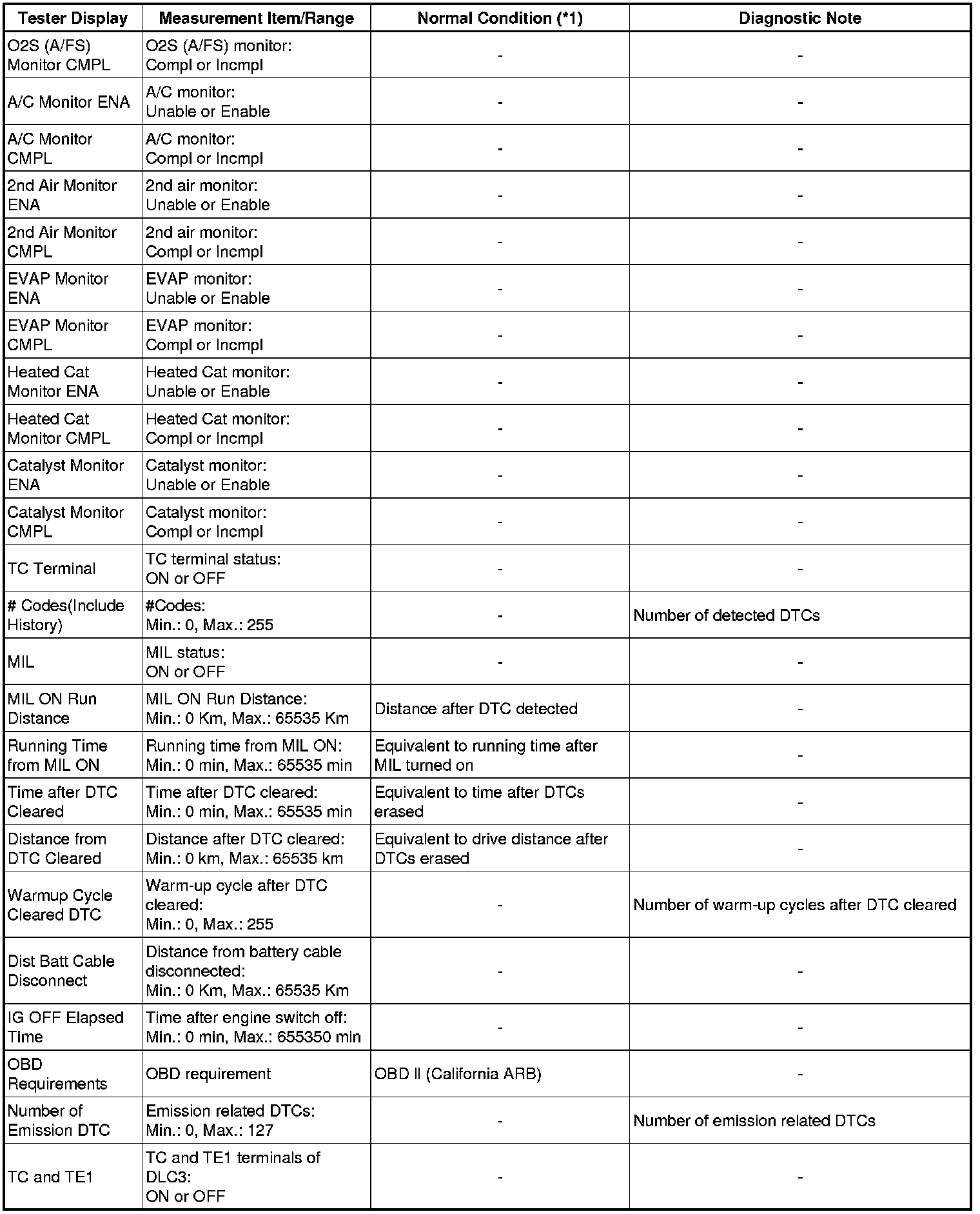 In the table below, the values listed under Normal Condition are for reference only. Do not depend solely on these values when determining whether or not a part is faulty.