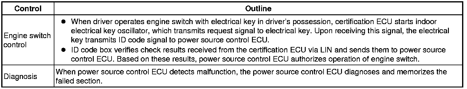 (a) The push-button start uses a push-type engine switch, which the driver can operate by merely carrying the electrical key. This system consists primarily of the power source control ECU, engine switch, ID code box, steering lock ECU, electrical key, ACC relay, IG1 relay, IG2 relay and certification ECU. The power source control ECU controls the system. This function operates in cooperation with the smart access system with push-button start.