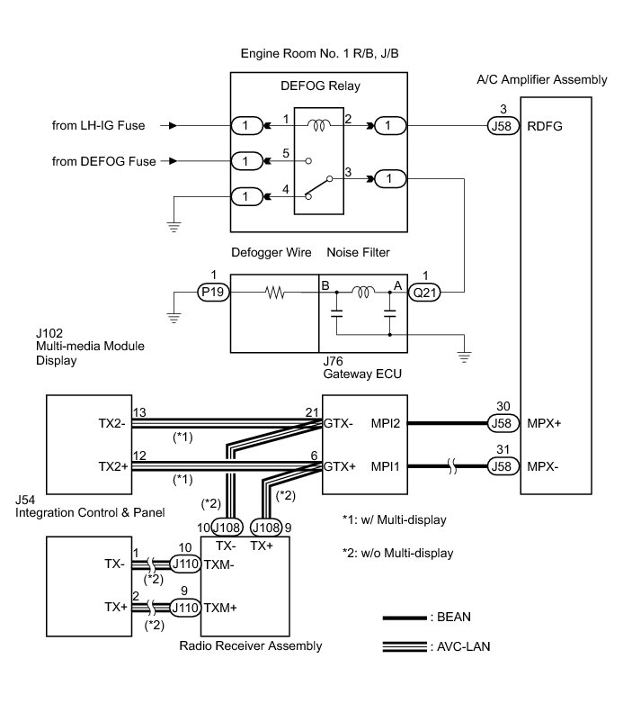 When the rear window defogger switch, which is built into the multi-media module display assembly, is operated, the operation signals are transmitted to the A/C amplifier assembly through AVC-LAN and BEAN. When the A/C amplifier assembly receives the signals, it turns on the DEFOG relay to operate the rear window defogger.