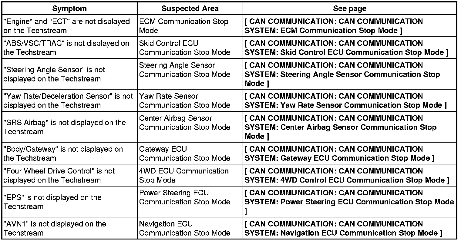 The suspected communication stop area can be determined based on the ECU or sensor that was not displayed in CAN Bus Check and by referring to the table below.