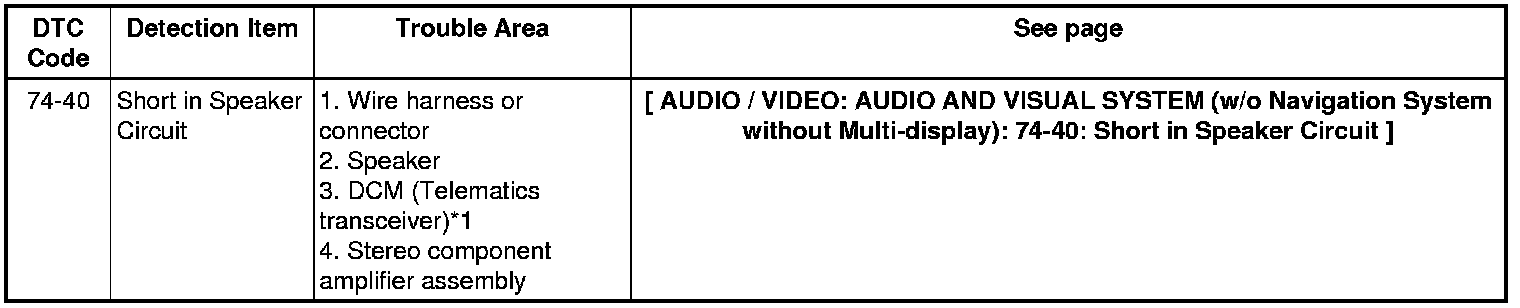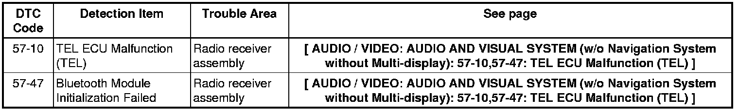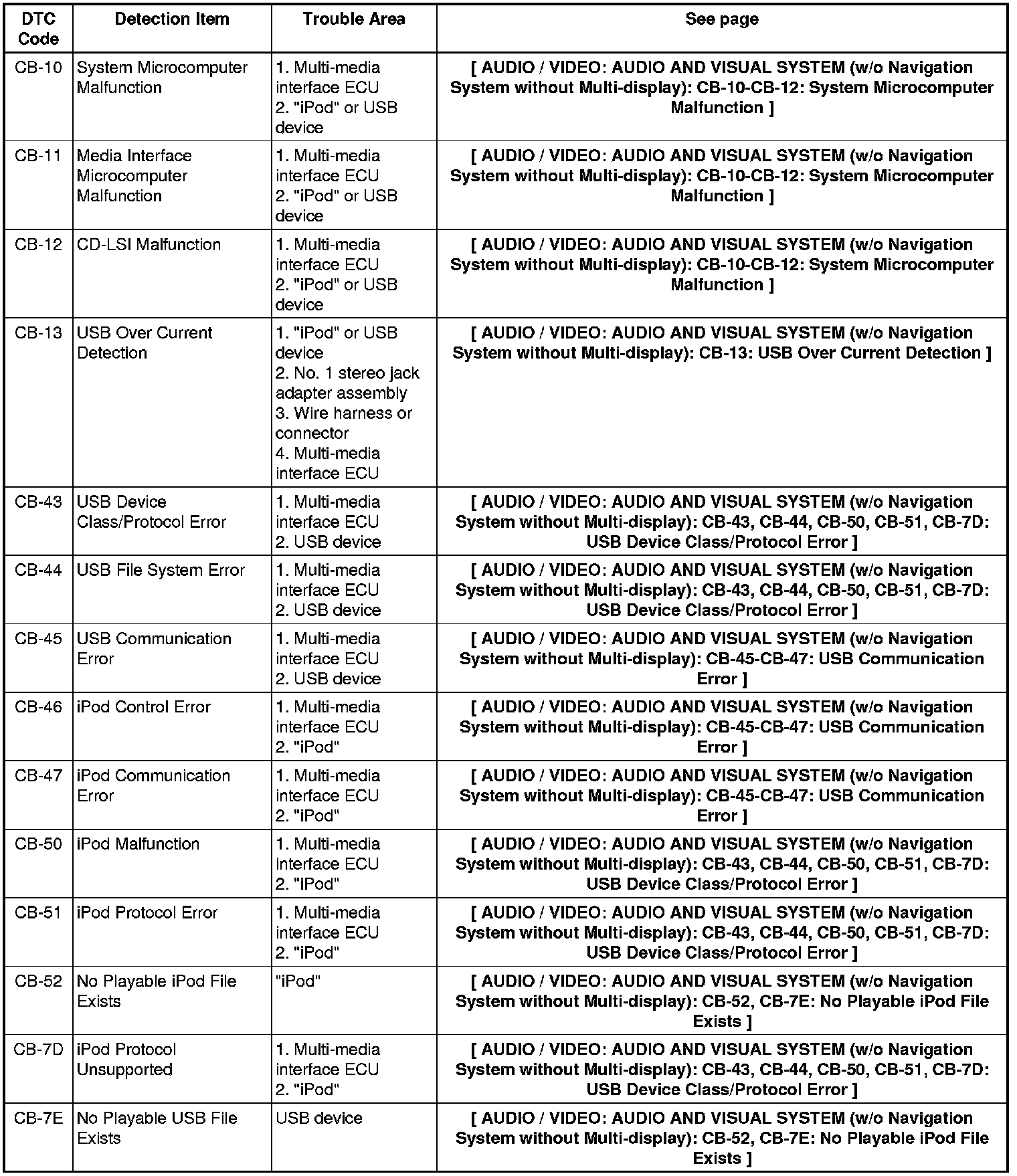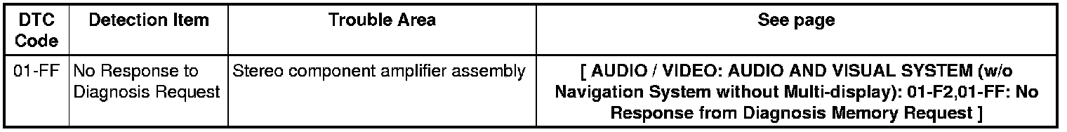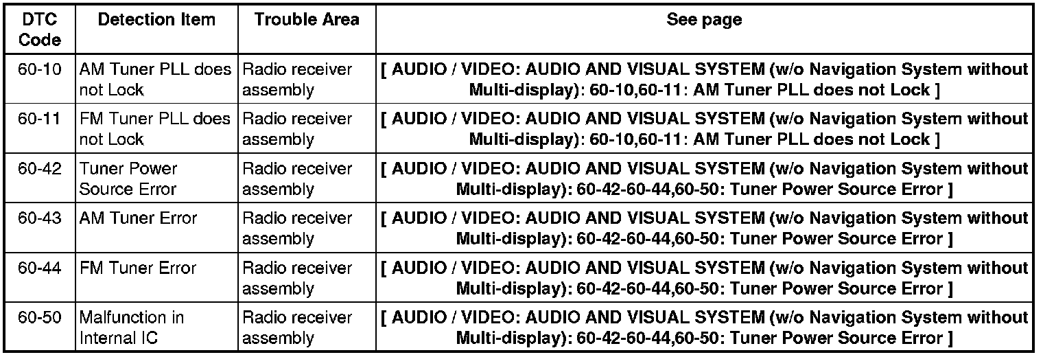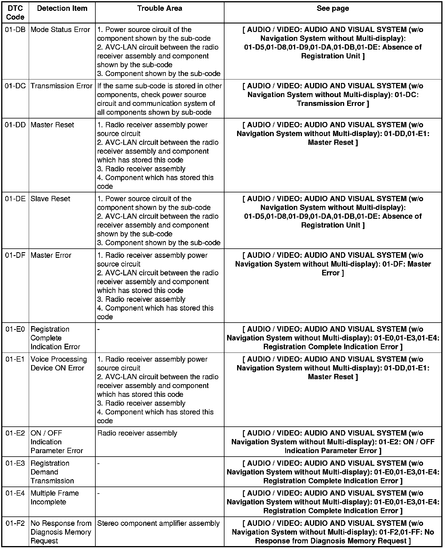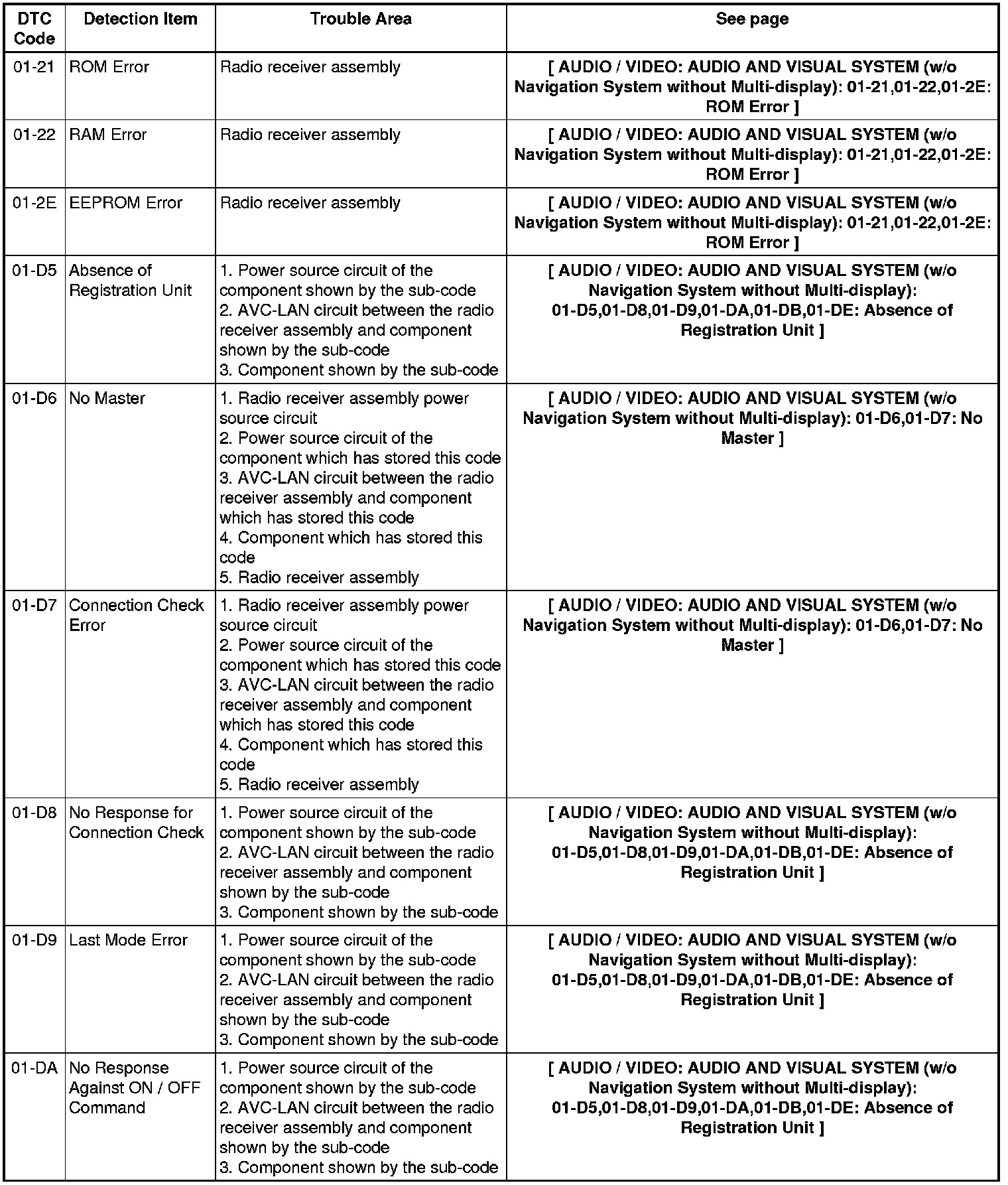 AUDIO / VIDEO: AUDIO AND VISUAL SYSTEM (w/o Navigation System without Multi-display): DIAGNOSTIC TROUBLE CODE CHART