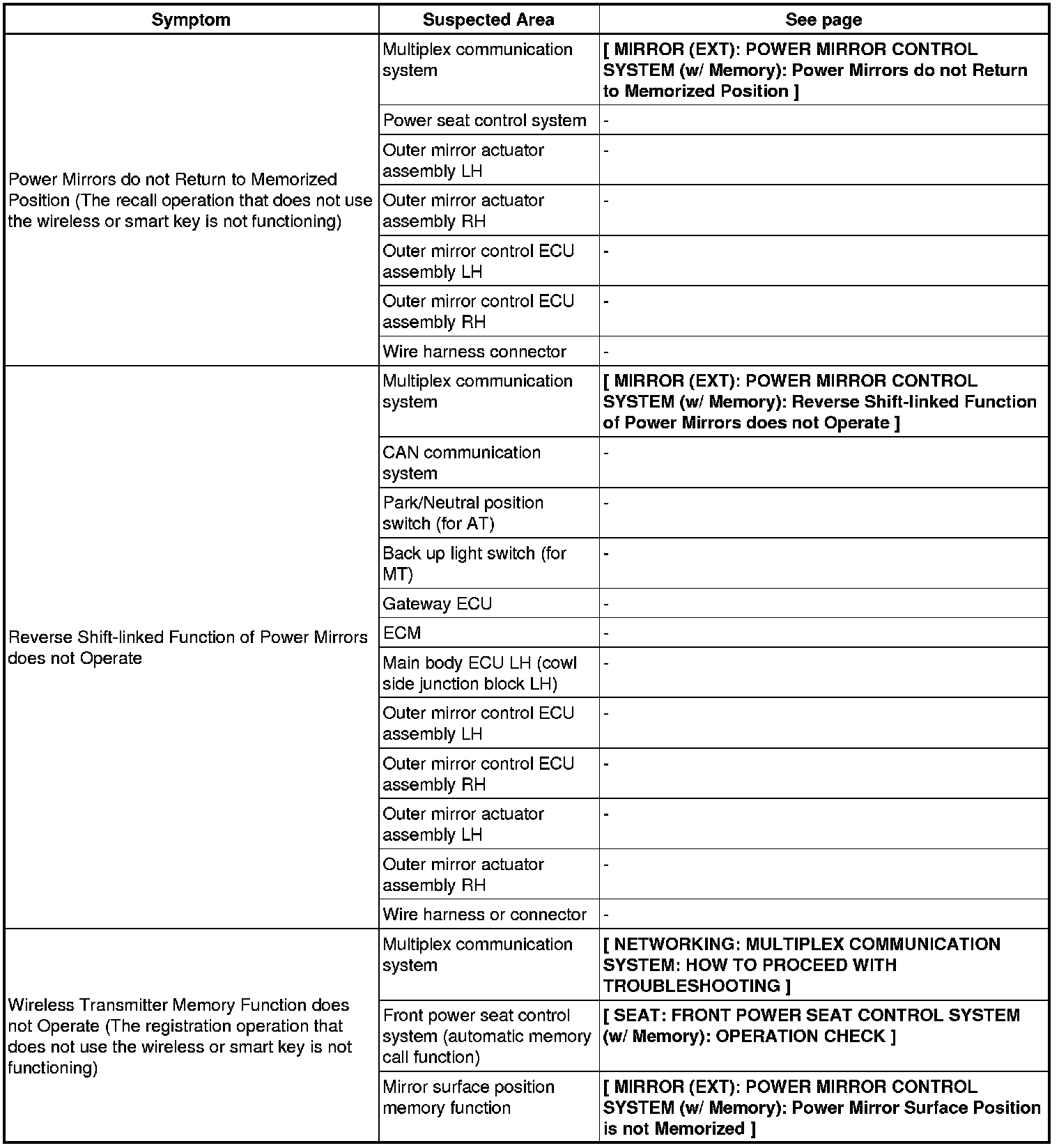 MIRROR (EXT): POWER MIRROR CONTROL SYSTEM (w/ Memory): PROBLEM SYMPTOMS TABLE