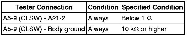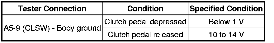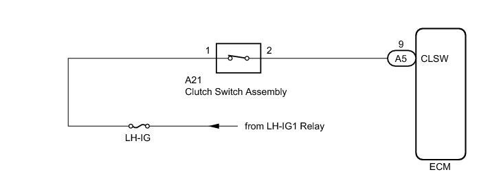 When the clutch pedal is released, the ECM receives battery voltage through the LH-IG fuse. When the clutch pedal is depressed, the clutch switch assembly for the cruise control opens, and voltage is no longer sent to terminal CLSW of the ECM. The ECM cancels cruise control operation when the battery voltage to terminal CLSW interrupted.