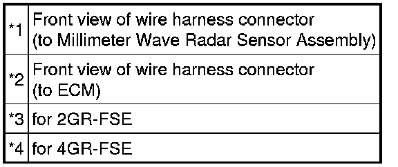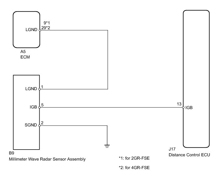 This circuit provides power to the millimeter wave radar sensor assembly. The millimeter wave radar sensor assembly emits radio waves toward an object in front and measures the distance and direction of the object by receiving the beam reflections. Based on the reflections, the sensor calculates the difference in speed between the vehicle and the object in front. This data is transmitted to the distance control ECU. The ECU recognizes the millimeter wave radar sensor assembly via terminals LGND. If an open circuit occurs in the wire harness between terminals LGND, the ECM cannot recognize the millimeter wave radar sensor assembly. The ECM will prohibit vehicle-to-vehicle distance control mode and only the constant speed control mode can be used.