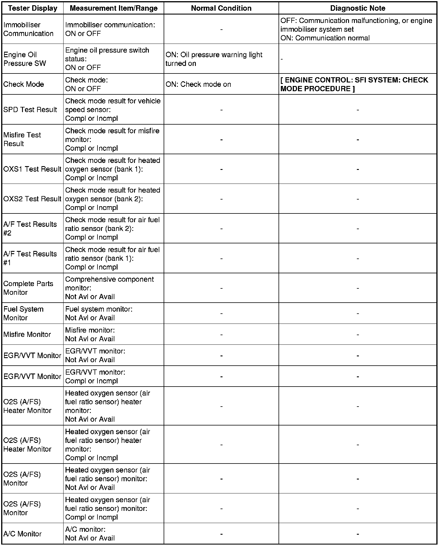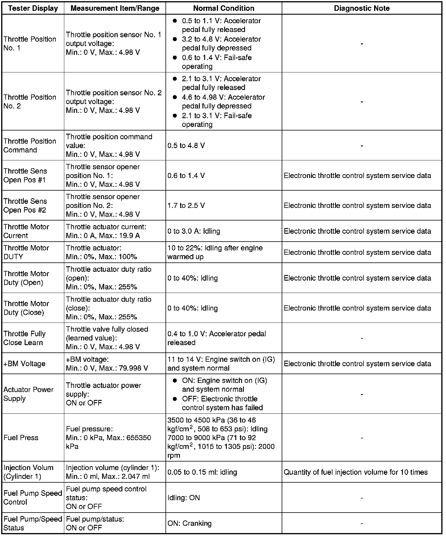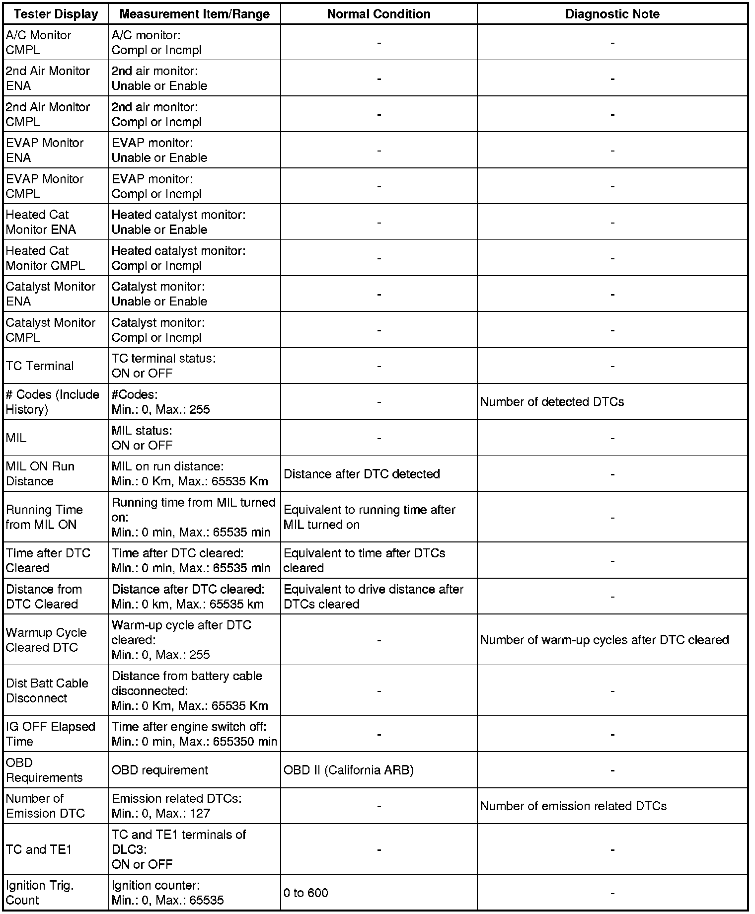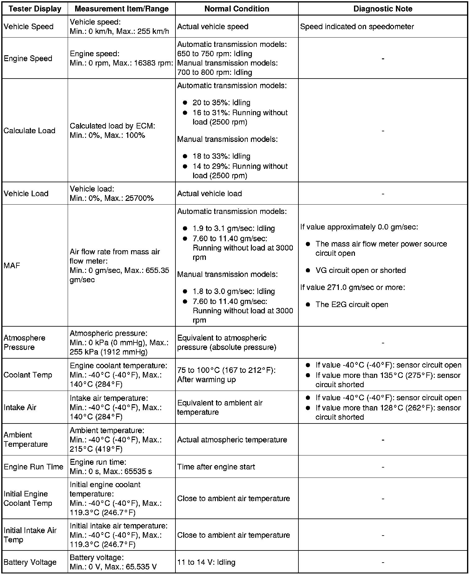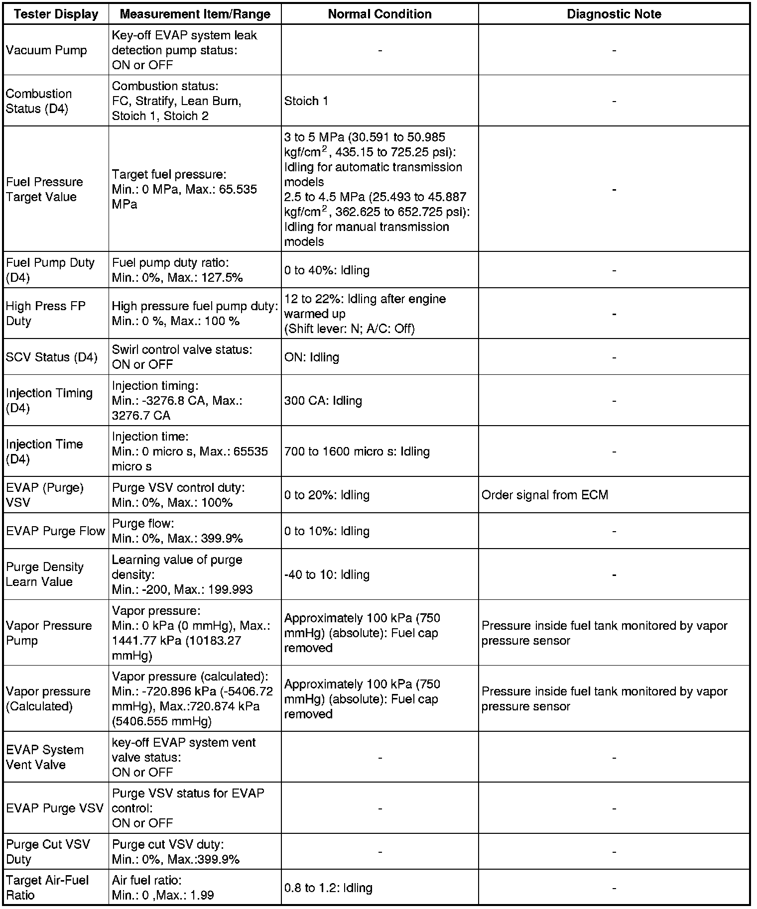 Using the Techstream to read the Data List allows the values or states of switches, sensors, actuators and other items to be read without removing any parts. This non-intrusive inspection can be very useful because intermittent conditions or signals may be discovered before parts or wiring is disturbed. Reading the Data List information early in troubleshooting is one way to save diagnostic time.
