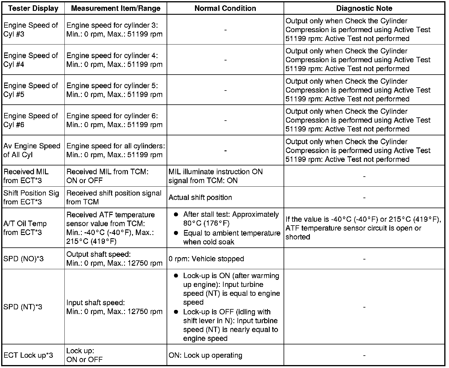 At first, the Techstream displays extremely high cylinder engine speed values. After approximately 10 seconds of engine cranking, each cylinder engine speed measurement will change to the actual engine speed.