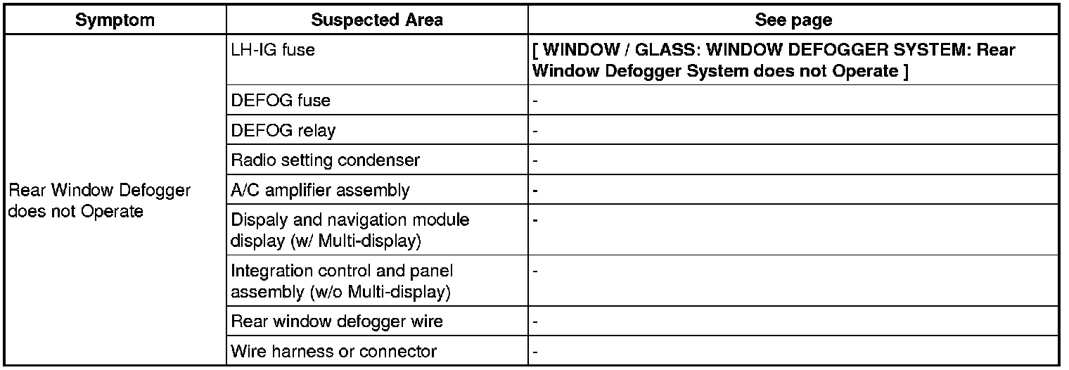 WINDOW / GLASS: WINDOW DEFOGGER SYSTEM: PROBLEM SYMPTOMS TABLE