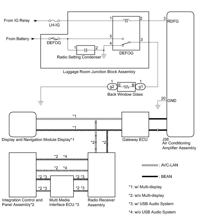 When the rear defogger switch built into the integration control and panel assembly is operated, a signal is sent from the display and navigation module display to the air conditioning amplifier assembly via AVC-LAN and BEAN communication. When the air conditioning amplifier assembly receives that signal, it turns the DEFOG relay on to operate the rear defogger.