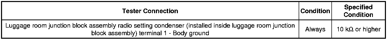 6. CHECK HARNESS AND CONNECTOR (RADIO SETTING CONDENSER (INSTALLED INSIDE LUGGAGE ROOM JUNCTION BLOCK ASSEMBLY) - BODY GROUND)