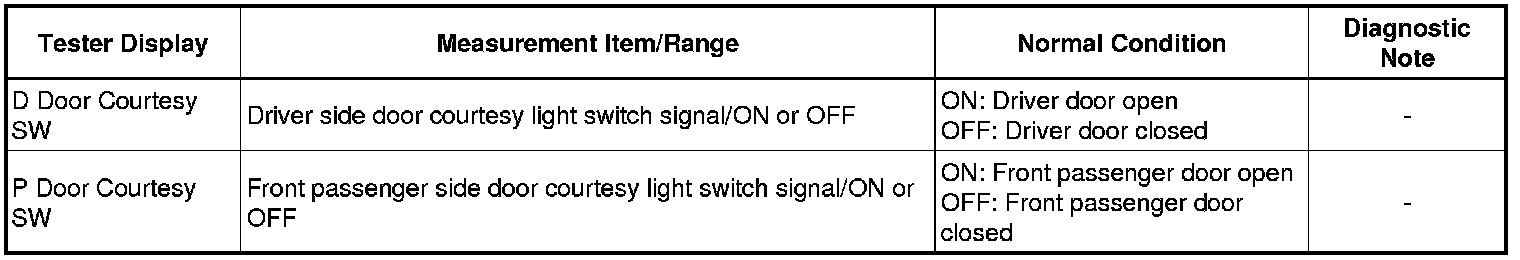 NG -- GO TO LIGHTING SYSTEM (Proceed to Door Courtesy Light Switch Circuit) Door Courtesy Switch Circuit