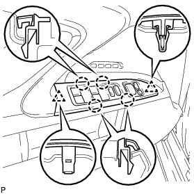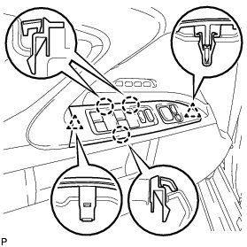 (2) Engage the 4 claws and 2 clips to install the power window regulator master switch assembly with front door armrest base panel.