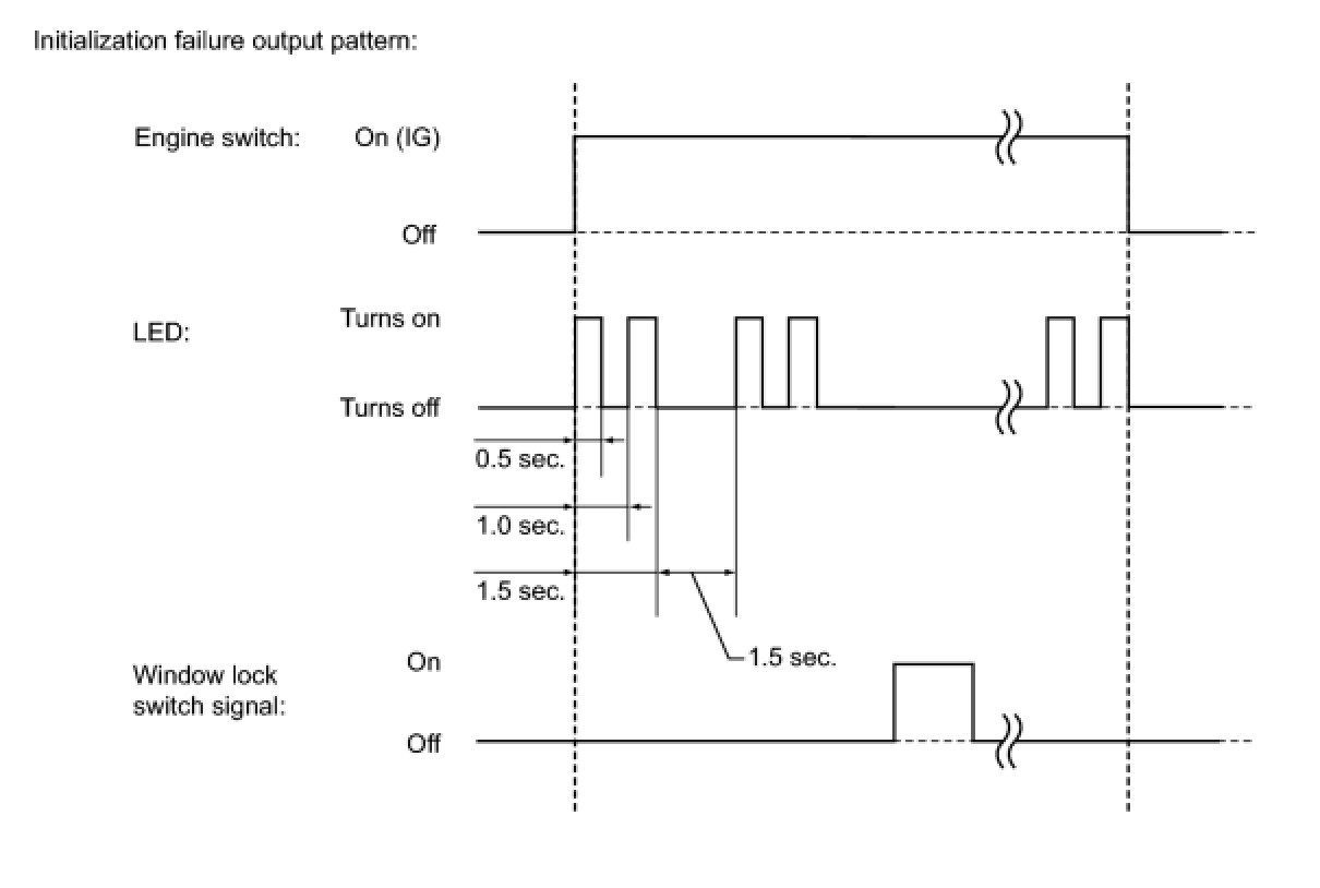During initialization of the power window regulator motor ECU, when the window position or initialization complete status cannot be properly read from the EEPROM, the power window control system prohibits the operations as follows: