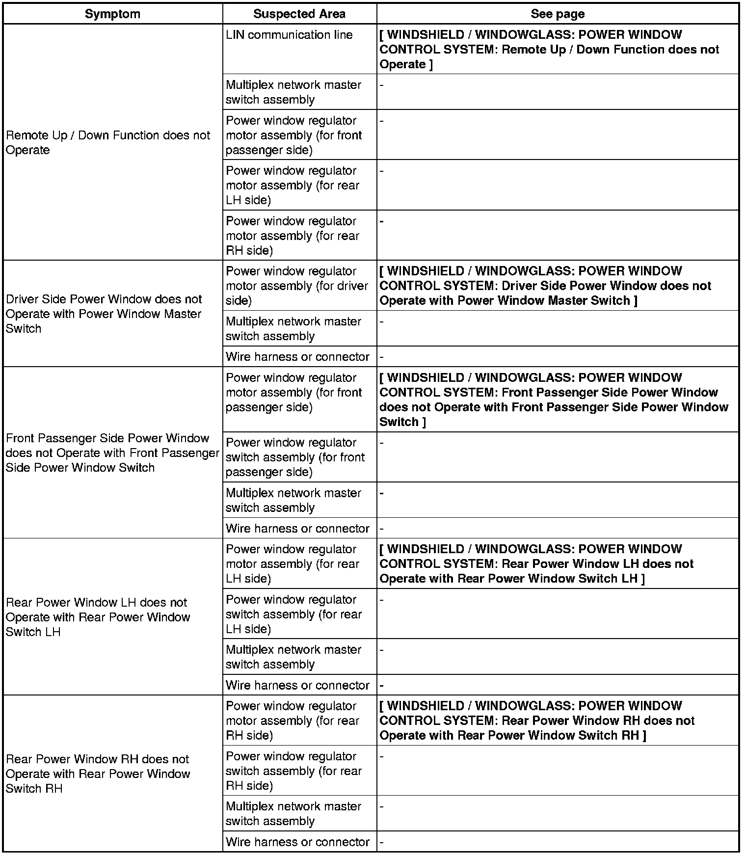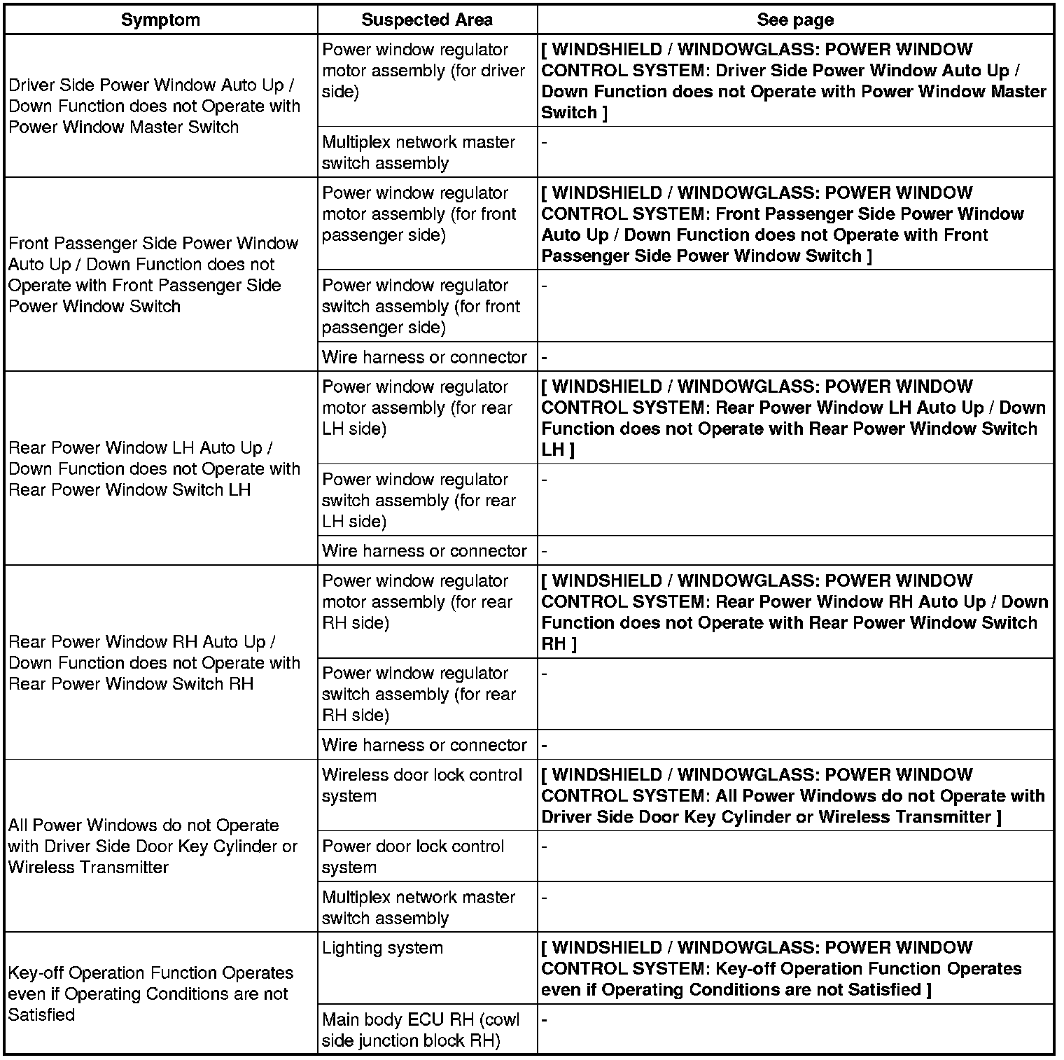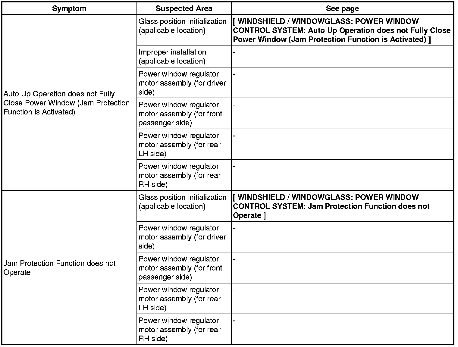 WINDSHIELD / WINDOWGLASS: POWER WINDOW CONTROL SYSTEM: PROBLEM SYMPTOMS TABLE