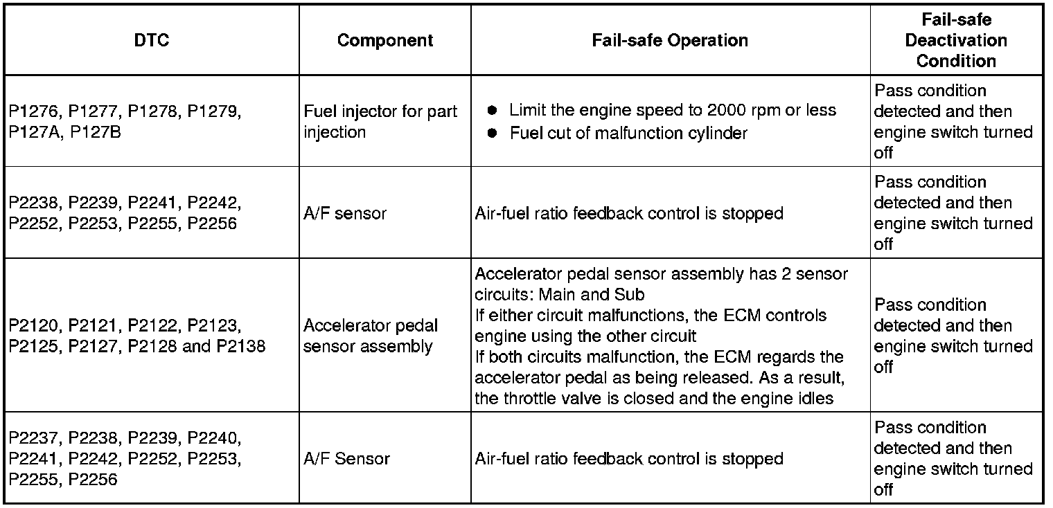 If any of the following DTCs are set, the ECM enters fail-safe mode to allow the vehicle to be driven temporarily.