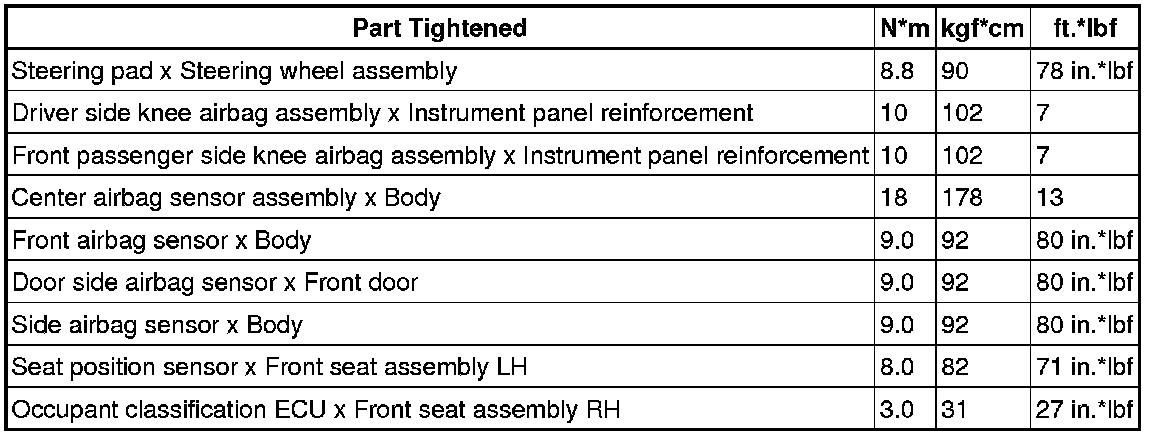 SPECIFICATIONS: SUPPLEMENTAL RESTRAINT SYSTEMS: TORQUE SPECIFICATIONS