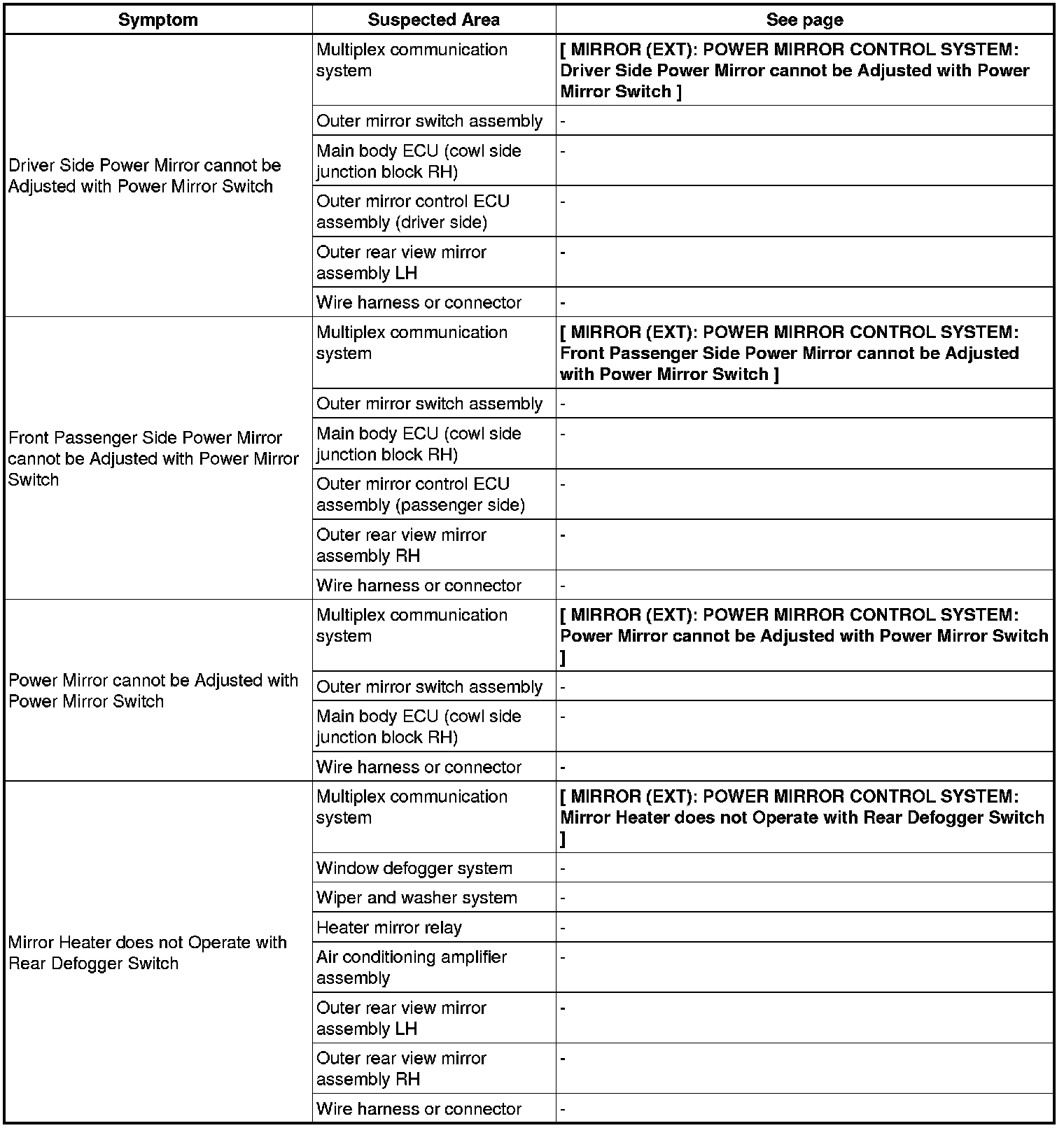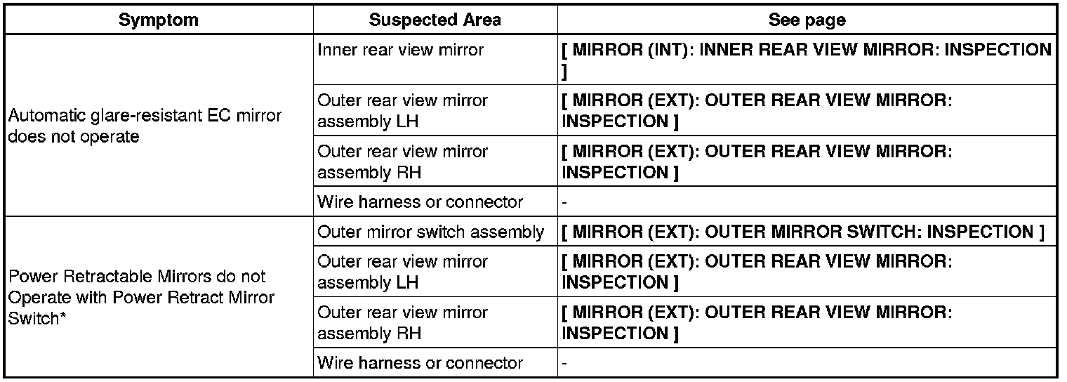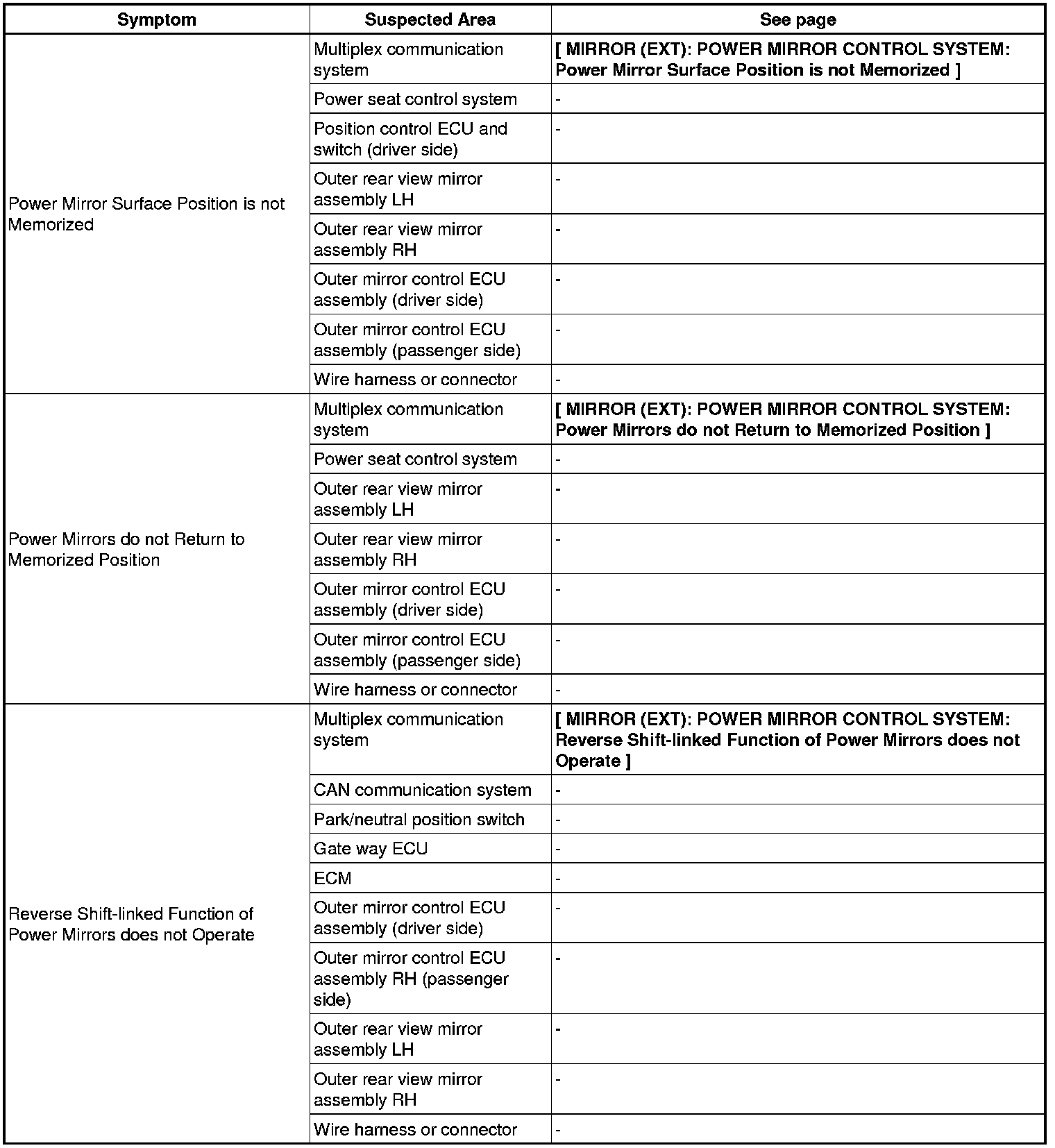 MIRROR (EXT): POWER MIRROR CONTROL SYSTEM: PROBLEM SYMPTOMS TABLE