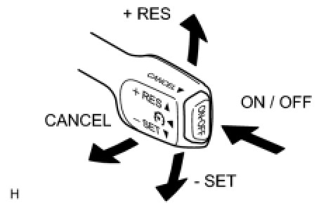 The cruise control main switch operates 7 functions: SET, - (COAST), TAP-DOWN, RES (RESUME), + (ACCEL), TAP-UP, and CANCEL. The SET, TAP-DOWN, and - (COAST) functions, and the RES (RESUME), TAP-UP, and + (ACCEL) functions are operated with the same switch. The cruise control main switch is an automatic return type switch which turns on only while operating it in the direction of each arrow and turns off after releasing it. The internal contact point of the cruise control main switch is turned on with the switch operation. Then the ECM reads the voltage value that has been changed by the switch operation to control SET, - (COAST), RES (RESUME), + (ACCEL), and CANCEL.